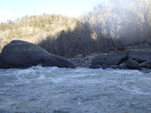- Last Drop (III+). This two part drop sports the biggest horizon line of the day. The first teir is a ramp that you want to be heading right to left across to hit the softest spot of the hole at the bottom. Below, the river goes into a huge house sized rock. I don't know if it is undercut, but I would imagine if you swim above the chances are good you will head straight towards it. At lake levels of 705 the flat water starts immediately below. There is current still though until Devil's Creek at 705.