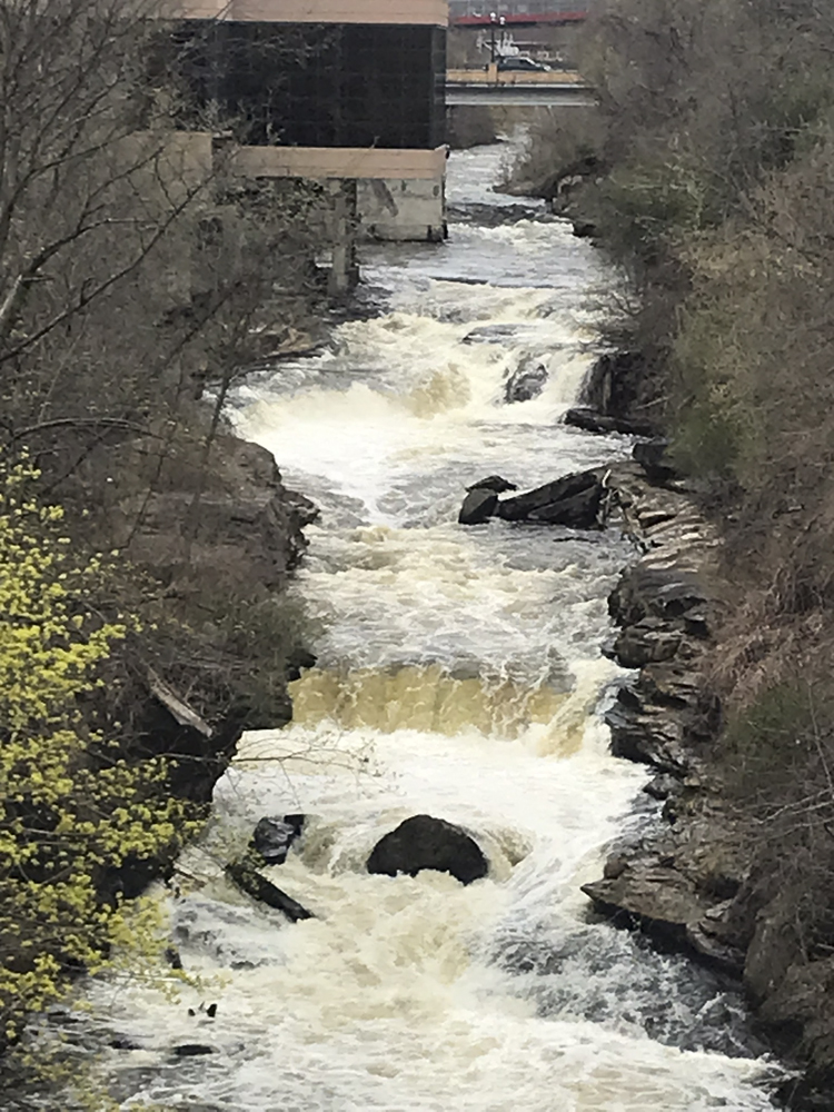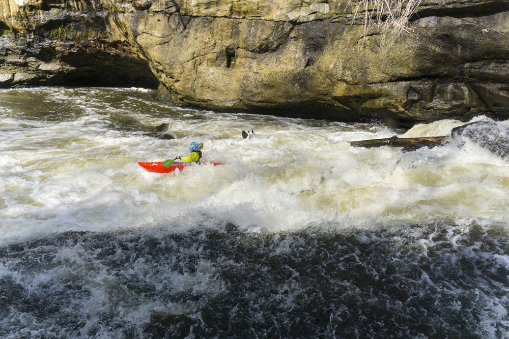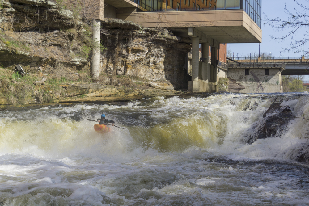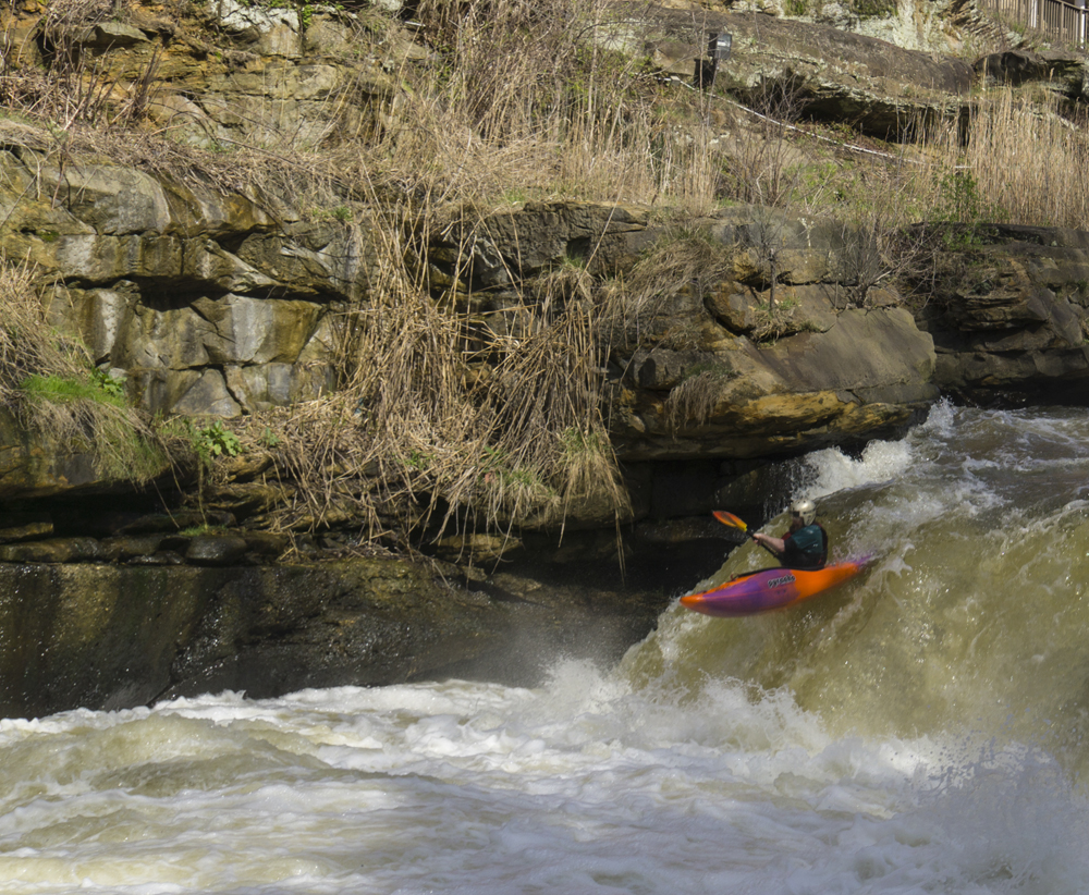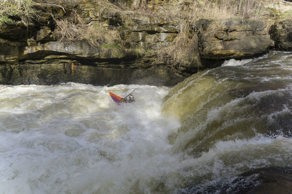 - Warm-up (II). A small riffle is all that stands between you and the falls from the put-in. There are some nice eddies to catch in it as well as a wave or two to surf. On the right there is a big staging eddy below a concrete structure, this is the remnants of the old dam that was taken out in 2013.