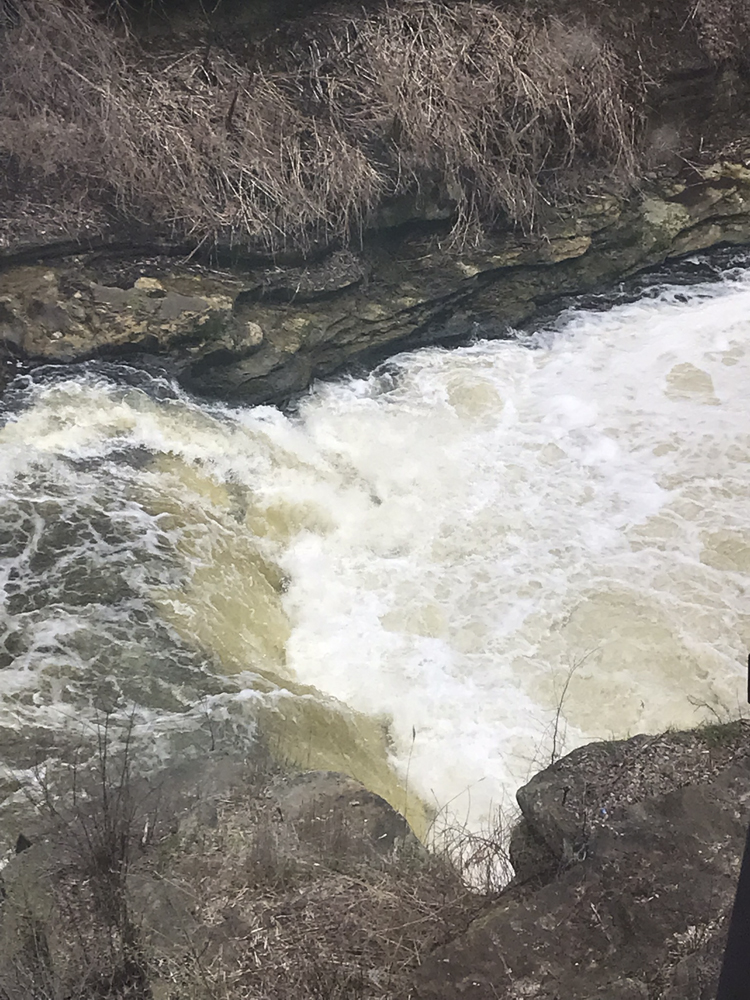 I spoke with some friends who were familiar with the area before going up there. I was told 600-900 is an ideal fun flow, few run it above 1,000 but certainly people do. And it can be scrapped down in the 300 range. I was told above 1,000 we likely wouldn't want to take turns soloing it. So to my frustration the day we arrive it was running 1,200. Two days later we scout it at the 980 or so range in the evening after hiking in the nearby Cuyahoga Valley National Park. To our surprise the second drop had a huge boil and looked super hard to have a clean line on. I guess AW's write up is more in alignment with the average local user and doesn't account for these higher water runs. To make matters worse, "The Jumble" (which is just the second have of the second drop) had a tree and picnic table in it making a right line very very dangerous indeed, honestly probably highly likely of a bad outcome. So we decide to put it off another 2 days instead of organizing a group for the following day. 2 days later, flows have now dropped to 840, its our last day, so we have to pull the trigger... assuming worst case scenario we run the first drop and then eddy out, scout, and potentially portage the second drop.