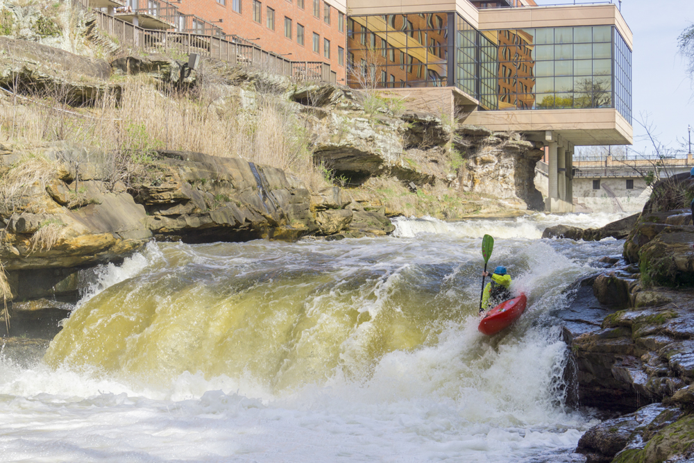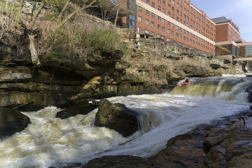 Put-in/Park and Huck: Next to Broad Blvd is a side parking area within the Sheraton Property. Currently, they are ok with you parking here. There is a stair case down to the wooden walkway which has a break in it which allows you to descend down to the river level. If you are parking and hucking, the first drop can be walked up on river right, the second drop on river left. You will want lower flows as you will have to attain up the warmup drop, also the eddy between the two rapids is sketchy with higher water.