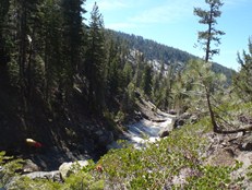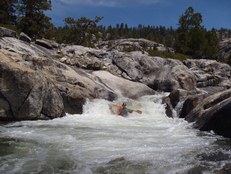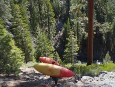 - Portage Gorge (V to U). The first drop is unrunnable. A 20 foot drop into a rock that then deflects either into the wall or into a sieve. Portage right around the house size rocks. Lowering the boats back down and friction climbing (bring your 5.10's!) down. A few runnable rapids lead to a boulder chock which is runnable but is followed by a slide into a nasty undercut. We chose to walk left. Below is another drop that we tried to scout but could not get a vantage at. It looked big and gross from what we could see. We continued our previous portage on the left. There was a 10 foot ledge just below that we ended up portaging in continuation as well due to difficulty of getting back down to the water. We put back in by down climbing a Manzanita ravine. Then went 50 feet, scouted another drop that went but were instructed to portage (right) from our one scout designee. It is a 10 foot boof with a reconnect. It wouldn't have been pretty, but would have gone in hindsight.