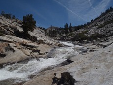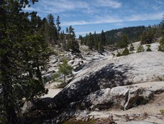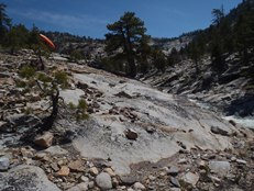 Put-in: Go back to Dinkey Creek Rd and go back towards Shaver Lake for 2.7 miles. Turning right on the nicely paved road marked 9S09. Follow for 5.2 miles to the dirt road leading down to the old quarry that can be seen from the road. Then start hiking... follow the ridge for a little bit and drop down to Cow Creek and cross it. Move downriver and head up and over the saddle when it becomes somewhat obvious... this will drop you at the base of the slide.