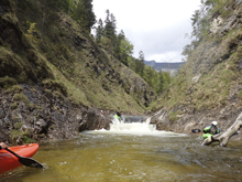 - Mandatory (V). The hardest rapid on the run is also the one that is hardest to portage. It is called mandatory but in fact you can get out and then lower boats back in just below the crux of the rapid. The crux starts with a slide into a 90 degree turn to the left. It wouldn't be bad if it weren't for the move just below. Because of the move, some choose to seal launch in below the two parts. The bottom move is to boof the middle of the 8 foot ledge with left angle. Do not error too far left though as the water reflects and shoots straight across the base of the drop and into the right wall which is badly undercut. Downstream is a small ledge to boof anywhere followed by a nice 8 foot left to autoboof far right.