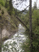 - Slides (IV). When you come to a horizon line you are at these slides. The first one we ran far right and clapped a little down some rocks. There is also a line far left. Downstream is a small ledge that you want to be far right on.