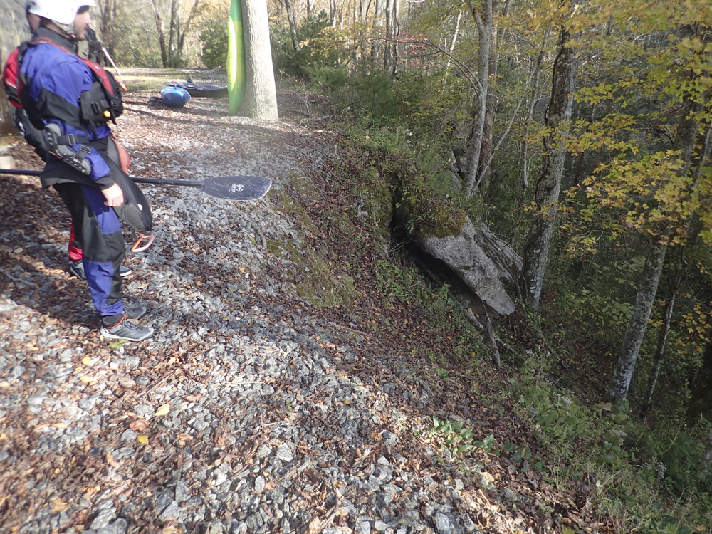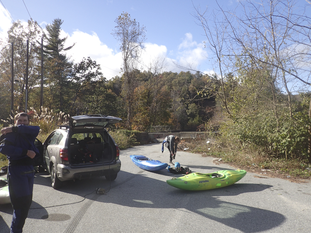 You park at the bridge over the river, after descending down to the water pipe, you cross under and continue up. Near the base of the dam, you descend down to the river. I have read reports of people getting skunked on trying to find a trail down and giving up and going back to near the bridge. The way down is steep, I won't lie. But we were able to carry our boats ourselves and none of us are billy goats.