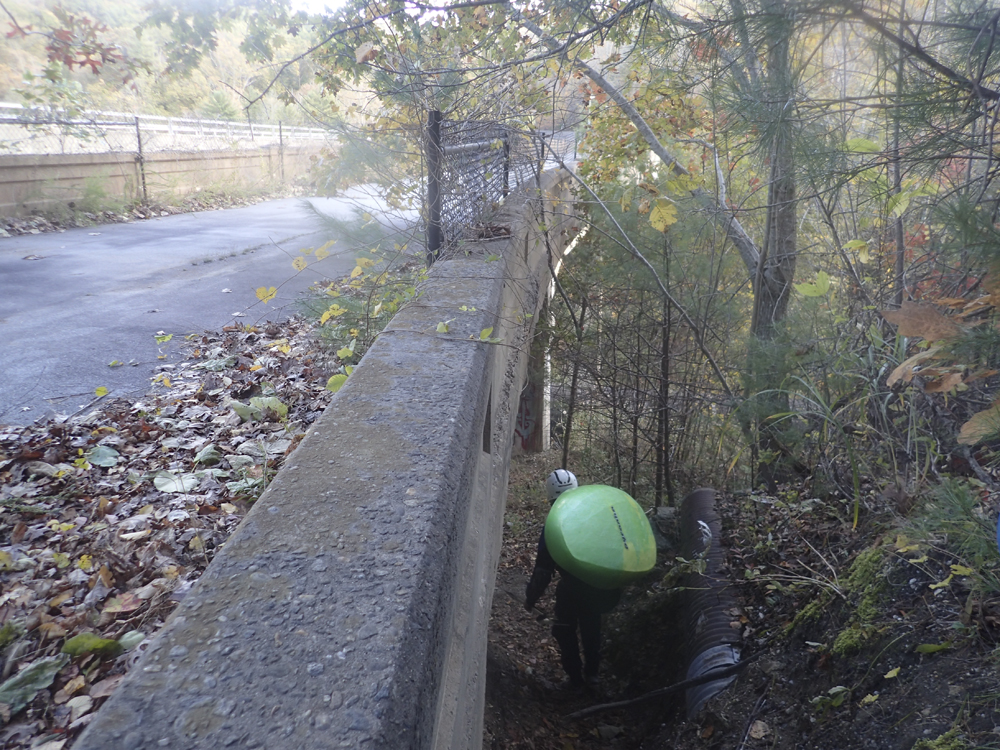 Put-in: Go back up to US 176 the way you came and turn left. Cross the river and pull into the parking area on the right on the far side of the bridge. Park there. Walk across the footbridge back to river left, go down the upstream side of the bridge. Walk downriver 10 yards to cross under the water pipe, and then head upstream. It is a quarter mile or so upriver to the base of the dam. We scrambled down just below the dam.