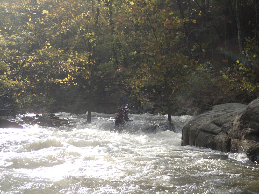 Hole (III to IV). Immediately downstream is a slide into a meaty hole. Being far left and straight (or pointing a little left) is the answer. I mean on the shore far left. Hugging it. It is possible to get out at the lip on the left, but it is tough. One in our group portaged right with difficulty.