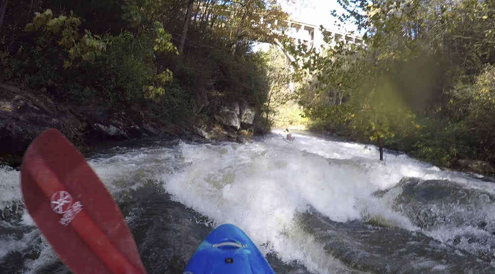 Exit Ramp (III+ to IV). Viewable from the powerhouse, the line is anywhere... though for us there was wood in the right and underwater in the right, so we dropped far left with left angle and momentum.