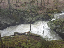 - Moonshine (V- to V). The first rapid comes just 100-200 yards downstream from put-in. Scout left or right. While left gives you the angle for the top drop, the right gives you the view of the bottom stuff. Personally, I think right is the way to go assuming you are ok running a 10 footer. The river splits with 10% going right and 90% going left. Scout before the split on the right. The left channel is what you run. A short lead in wants to push you far left, but you want to drive across the lip of the drop and boof hard right going right to land in the eddy rather than being pushed downstream on the far left into the rocks. In the eddy, now go all the way down the right for two ledges. Around the corner is another pinch drop that has an undercut on the right, and a rock on the left. Go down the middle erroring slightly left.