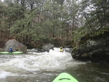 Piton (IV). Just downstream is another blind rapid. After a busy entrance the rapid bends right blindly, the right looks like the spot to be but it boofs right into a big piton. I found it. The left of center is a much kinder step-down drop.