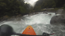 - Crux (IV to IV+). As the river bends left, where the highway breaks away from the river, the crux greets you. There are two holes, the second one stouter than the first, and the second one pushes right into an undercut on the right. Boof both driving left across both. Set safety on the right if need be.