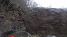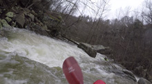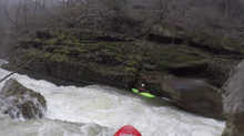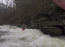 Cliff Right (IV). Immediately below, the river goes right around a house sized rock. We eddied out on the left, note there is a big sieve there. This then allows you to see the rapid. Run along the backside of the house sized rock to the right, boof a small ledge, then straighten out and go down the right wall with a little left angle.