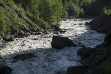 Split (III-). Not far downstream the river hits a midstream rock, creating a big pillow. We went to the right of it. It looked more intimidating from above than it was.