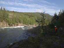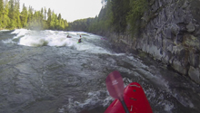 - Sneak (IV to V). The sneak was easy enough down the right amongst outcroppings of bedrock. If it was higher still though, this might even close out some and turn into pour overs. The left side of the river had a huge curler (like 15 feet tall) that folded right into a mammoth pocket hole against the island. The challenge would be that there is also a huge eddy line that would prevent you from getting left enough to clear through the curler without dropping into the hole. At our flow, sneaking was the only viable option.