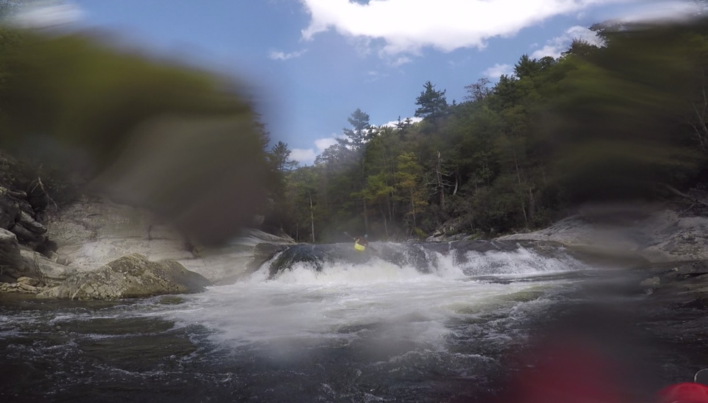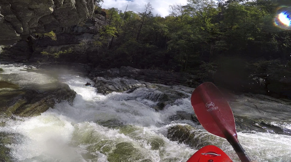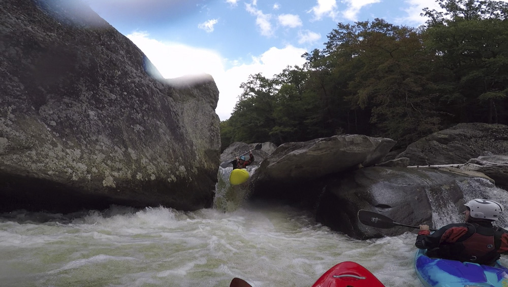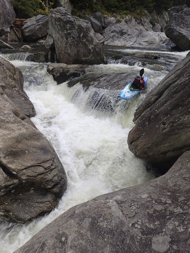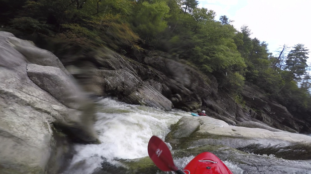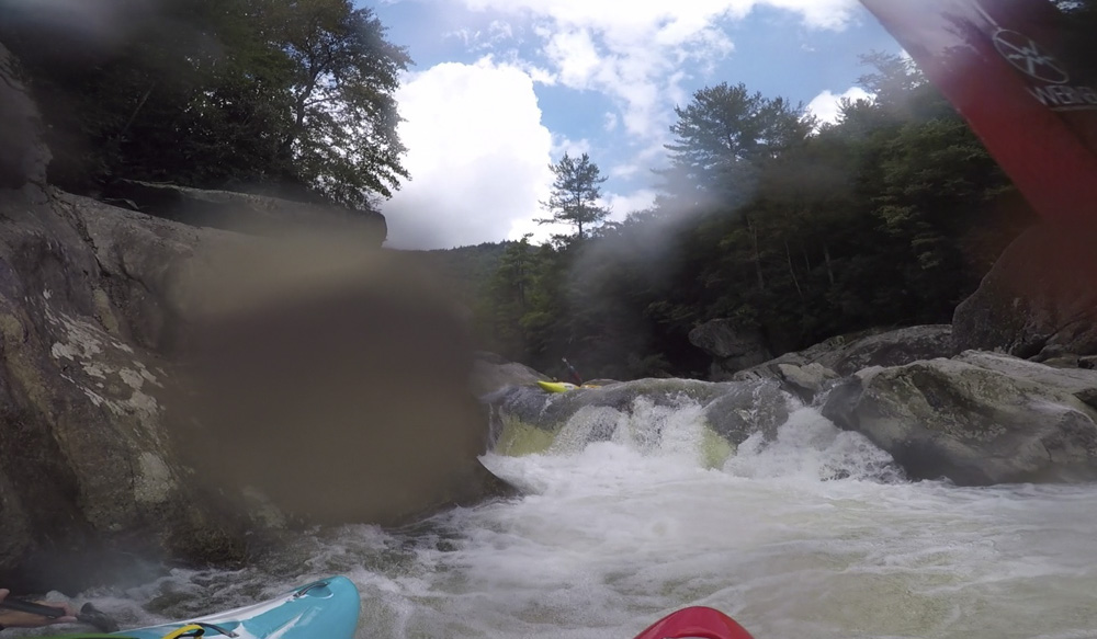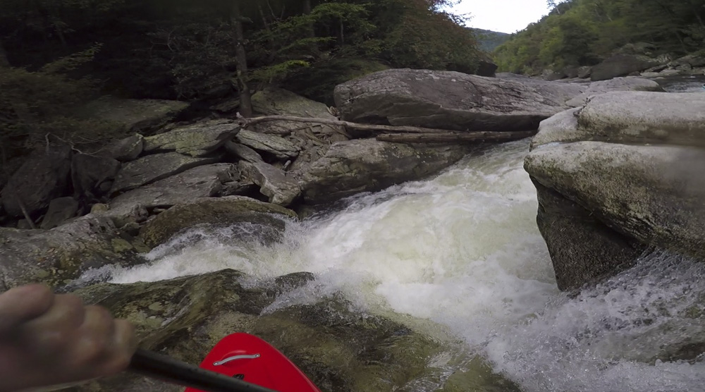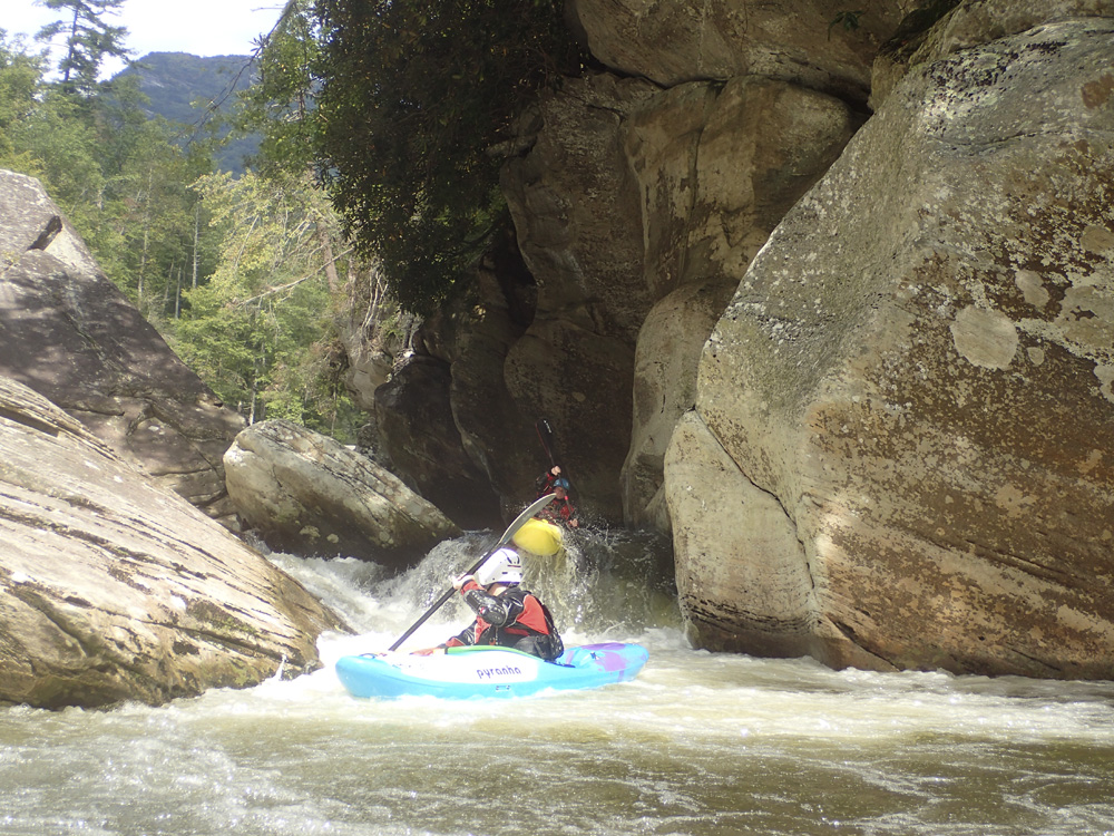 Blind Side (IV to IV+). The next one isn't that hard, but must be hit correctly. A small boof against the left shore marks the entrance before 20 feet then leads to another ledge. On this bottom ledge be far right and with 90 degree right angle to drop into the small exit slot. If you don't hit it that way, you will land on rock, and potentially pin.