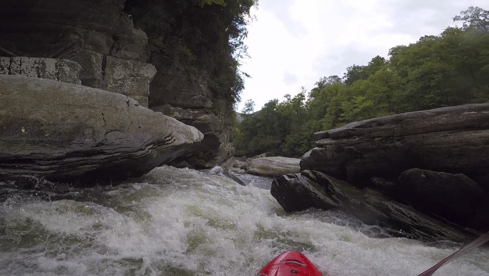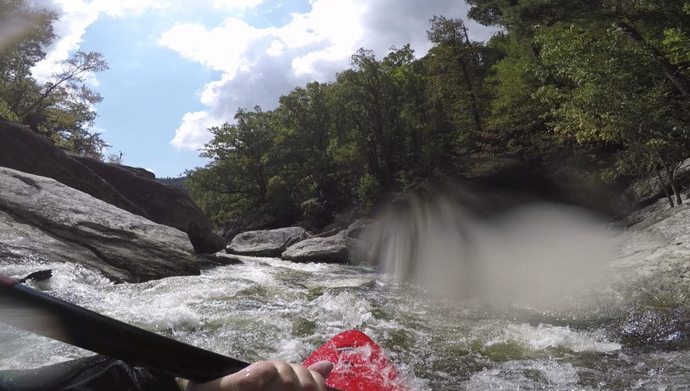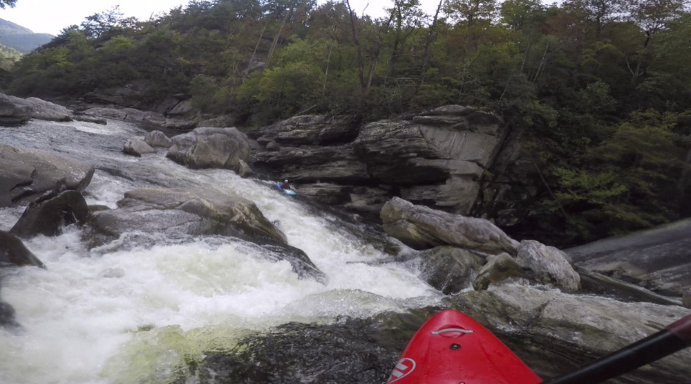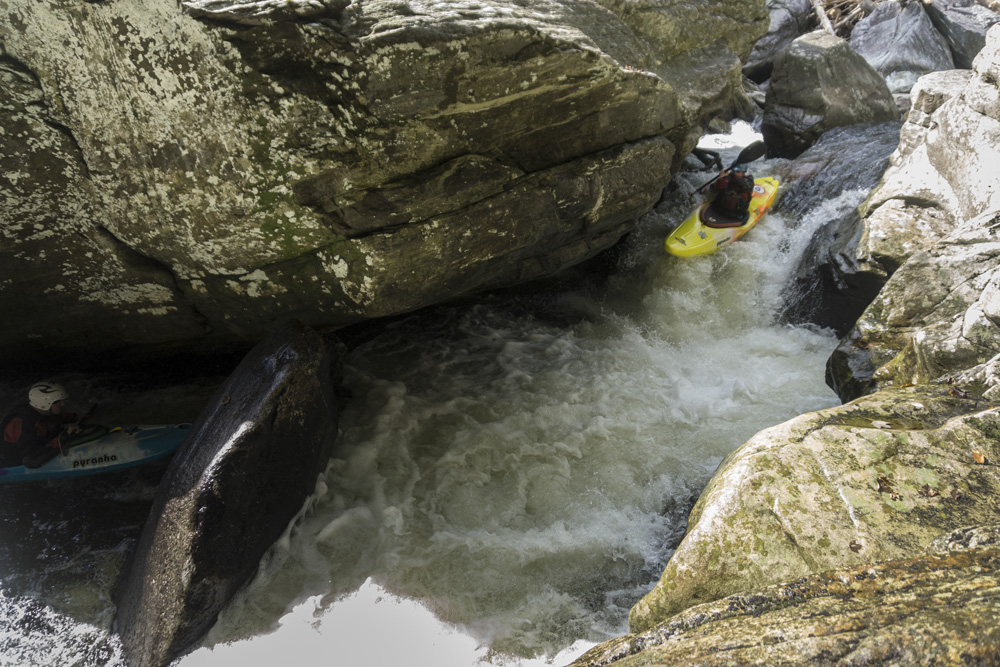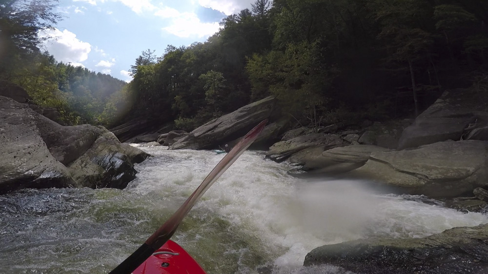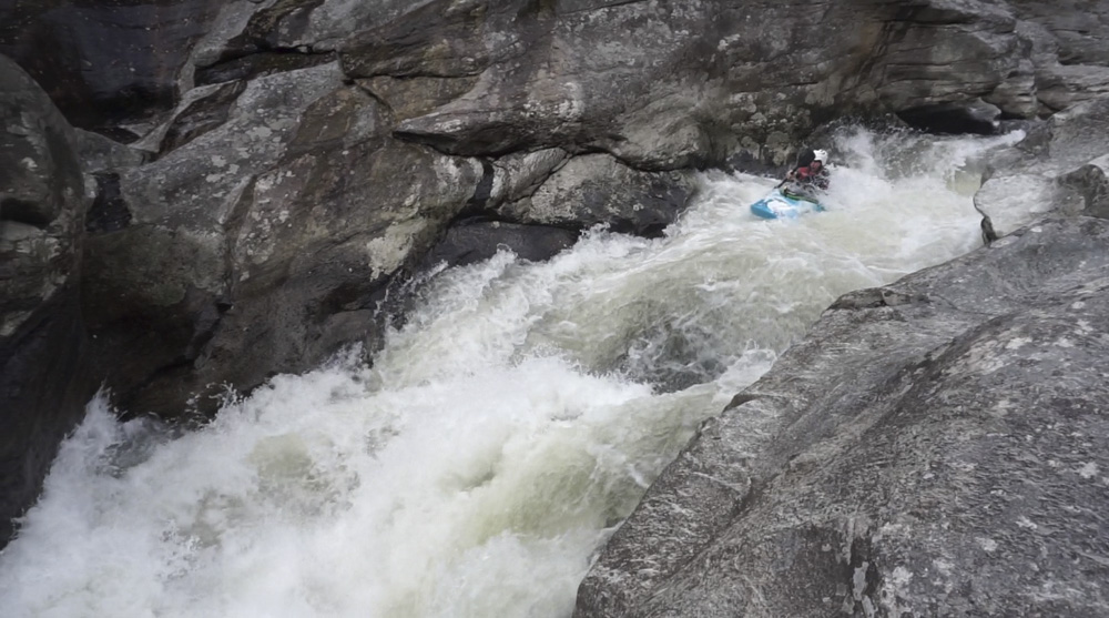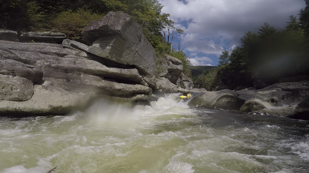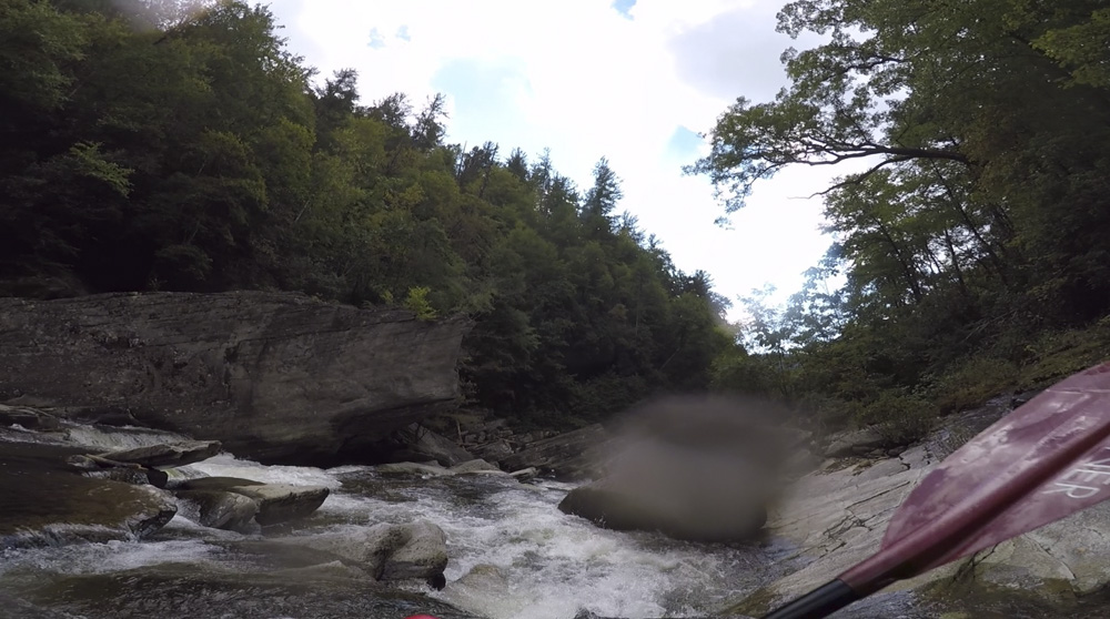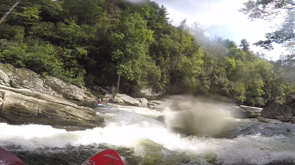Blind Side (IV to IV+). The next one isn't that hard, but must be hit correctly. A small boof against the left shore marks the entrance before 20 feet then leads to another ledge. On this bottom ledge be far right and with 90 degree right angle to drop into the small exit slot. If you don't hit it that way, you will land on rock, and potentially pin.
