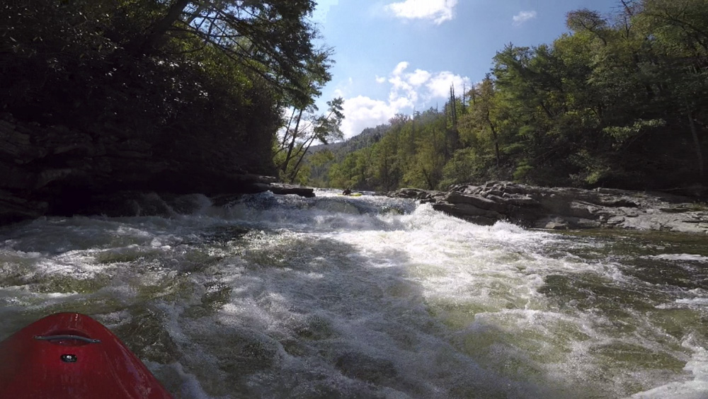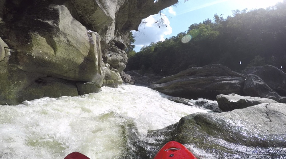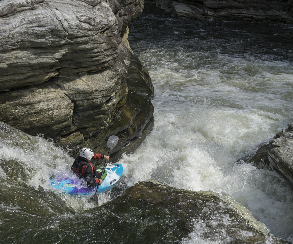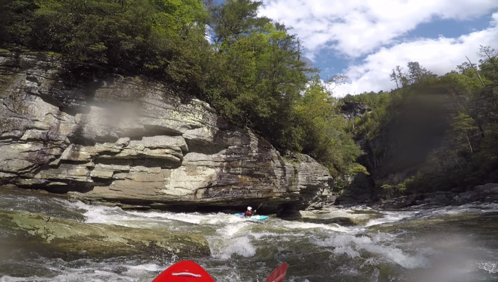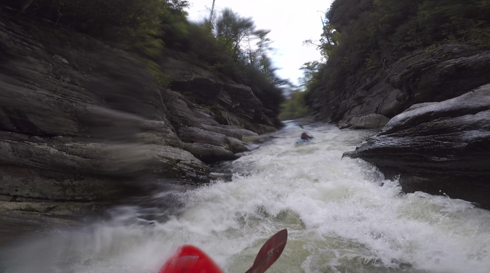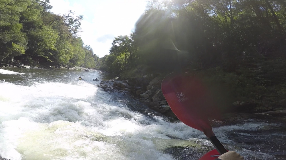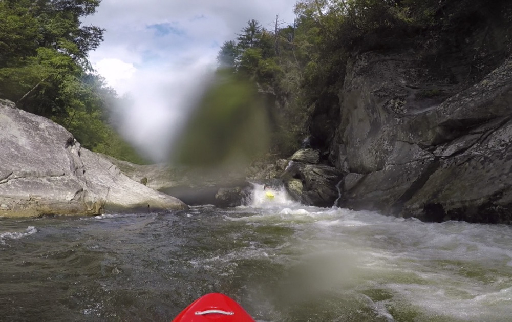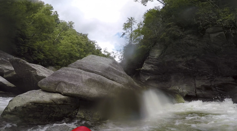 Blind Side (IV to IV+). The next one isn't that hard, but must be hit correctly. A small boof against the left shore marks the entrance before 20 feet then leads to another ledge. On this bottom ledge be far right and with 90 degree right angle to drop into the small exit slot. If you don't hit it that way, you will land on rock, and potentially pin.