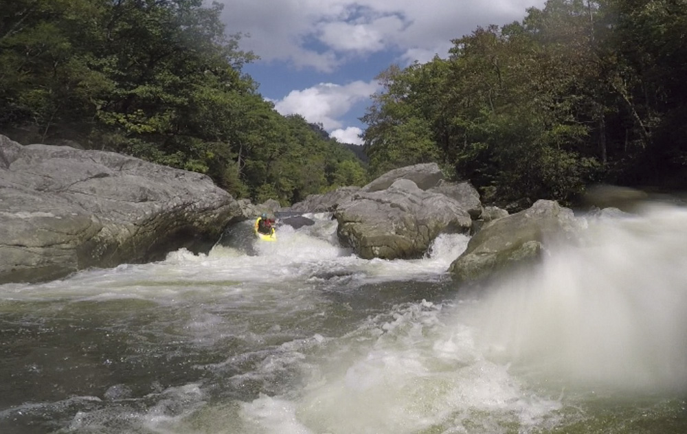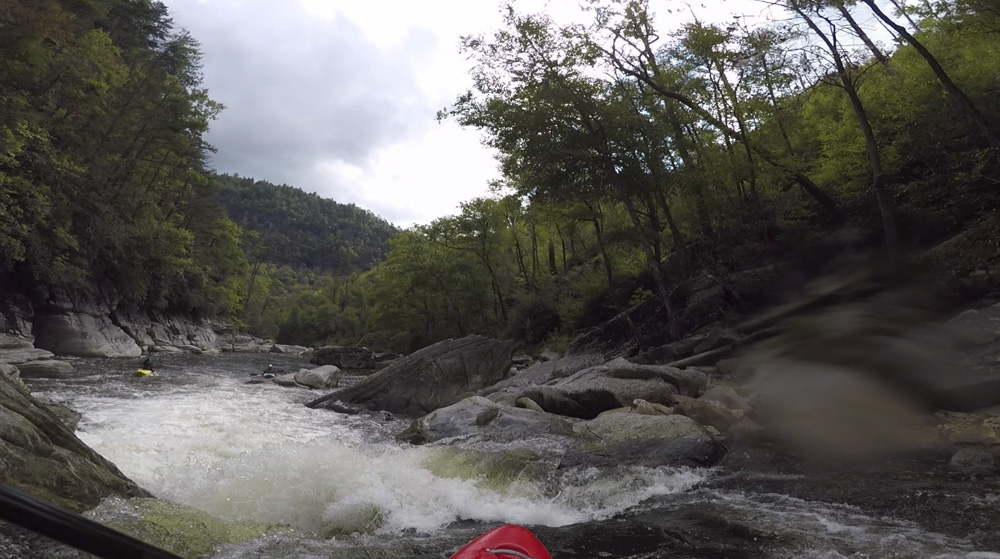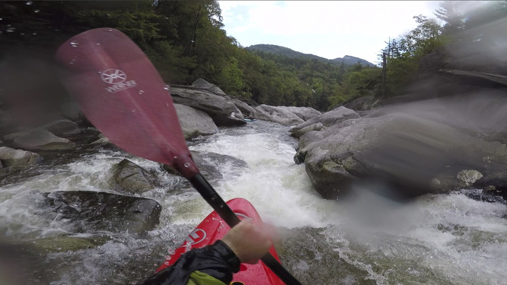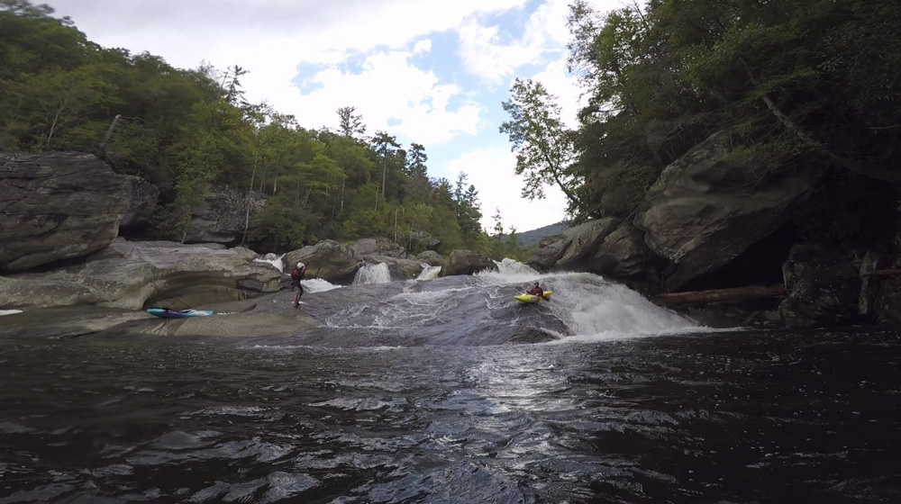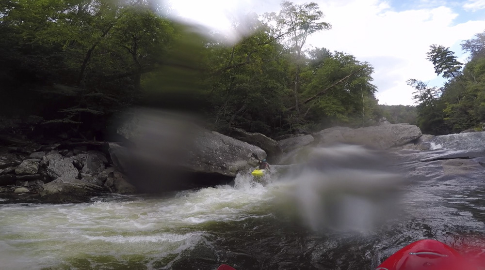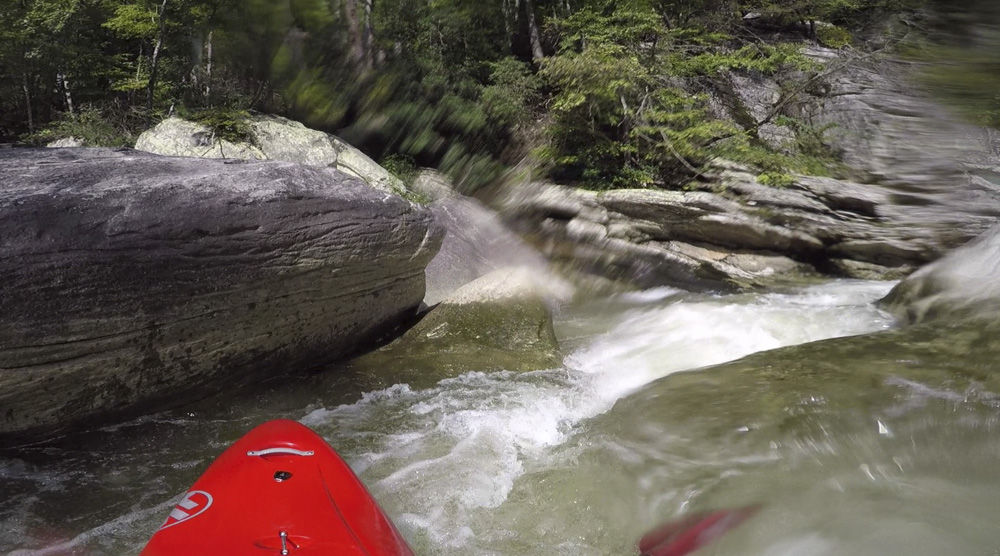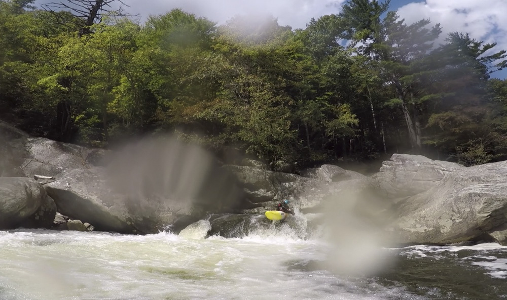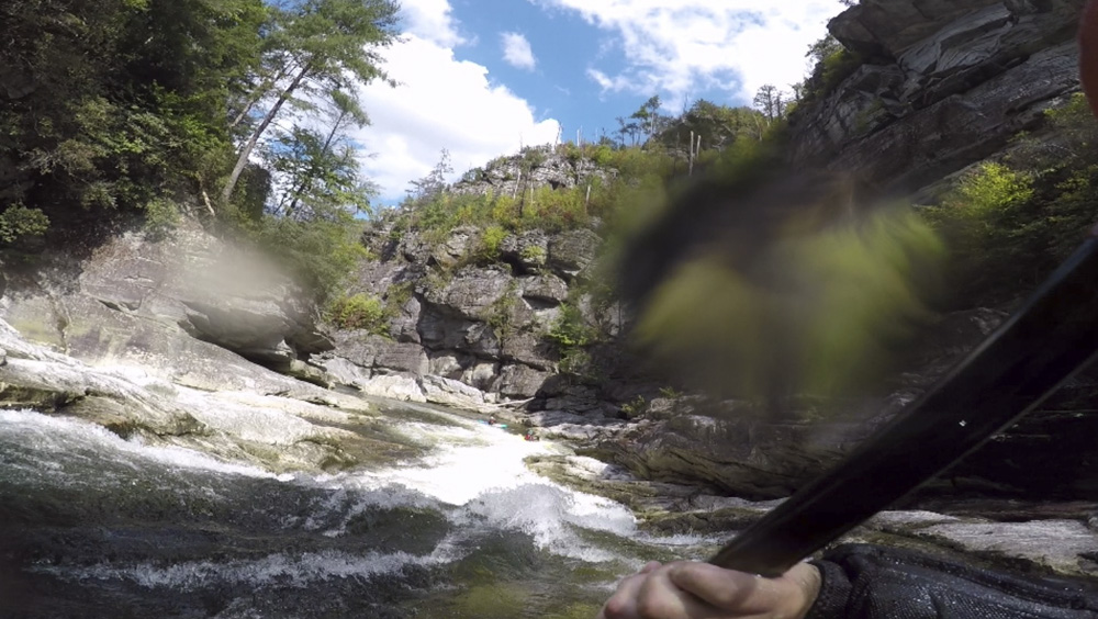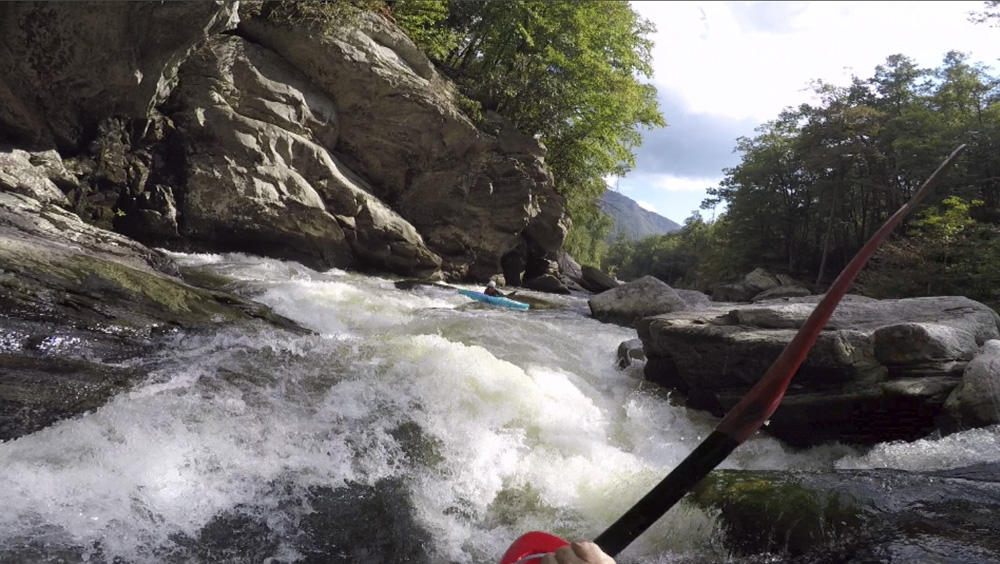Blind Side (IV to IV+). The next one isn't that hard, but must be hit correctly. A small boof against the left shore marks the entrance before 20 feet then leads to another ledge. On this bottom ledge be far right and with 90 degree right angle to drop into the small exit slot. If you don't hit it that way, you will land on rock, and potentially pin.
