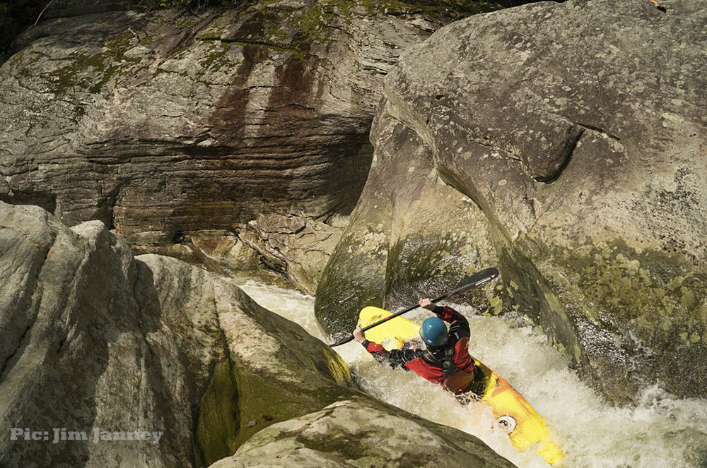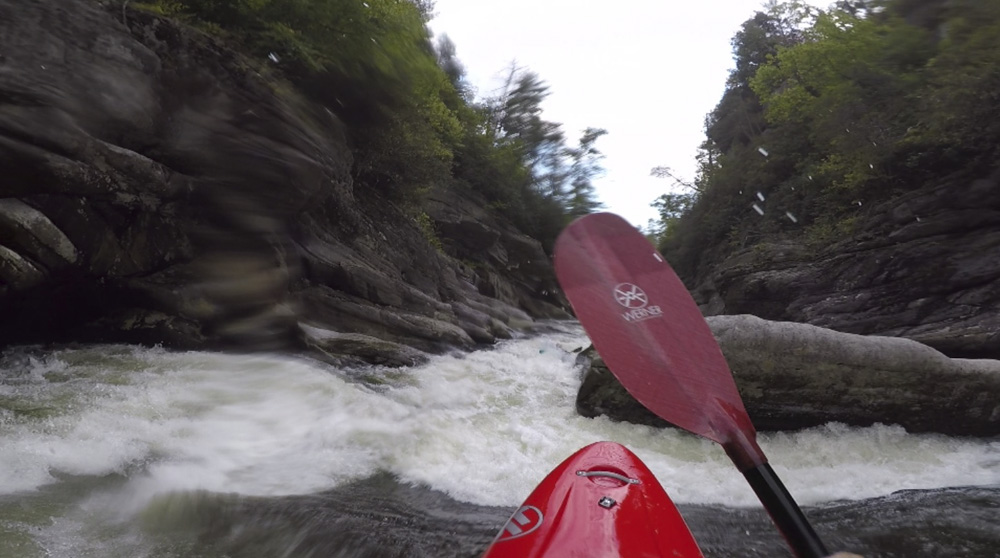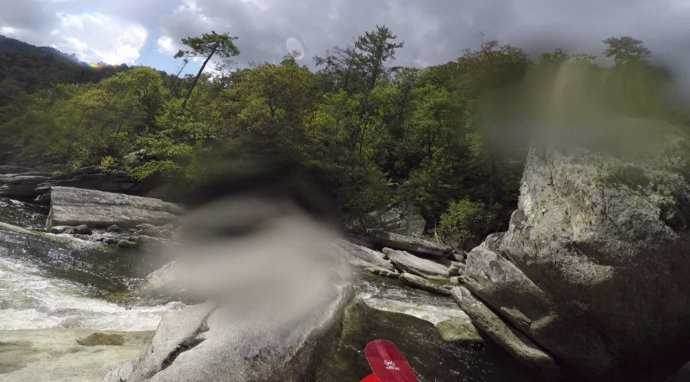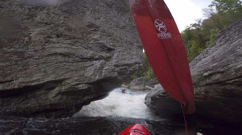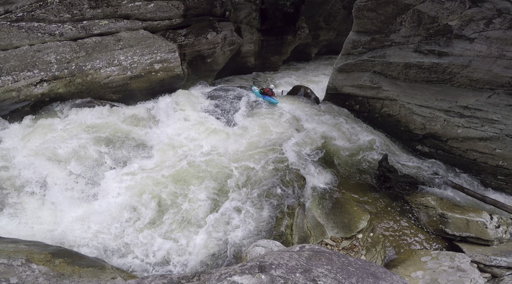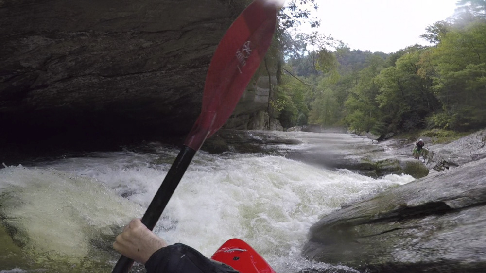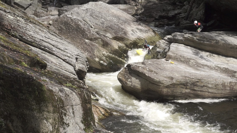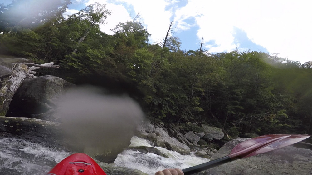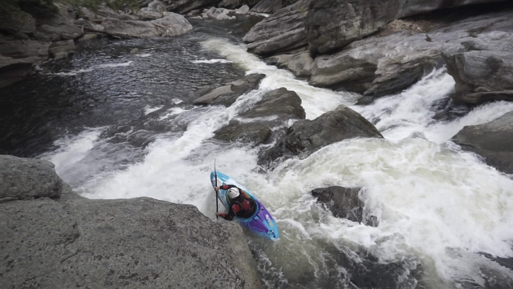 Blind Side (IV to IV+). The next one isn't that hard, but must be hit correctly. A small boof against the left shore marks the entrance before 20 feet then leads to another ledge. On this bottom ledge be far right and with 90 degree right angle to drop into the small exit slot. If you don't hit it that way, you will land on rock, and potentially pin.