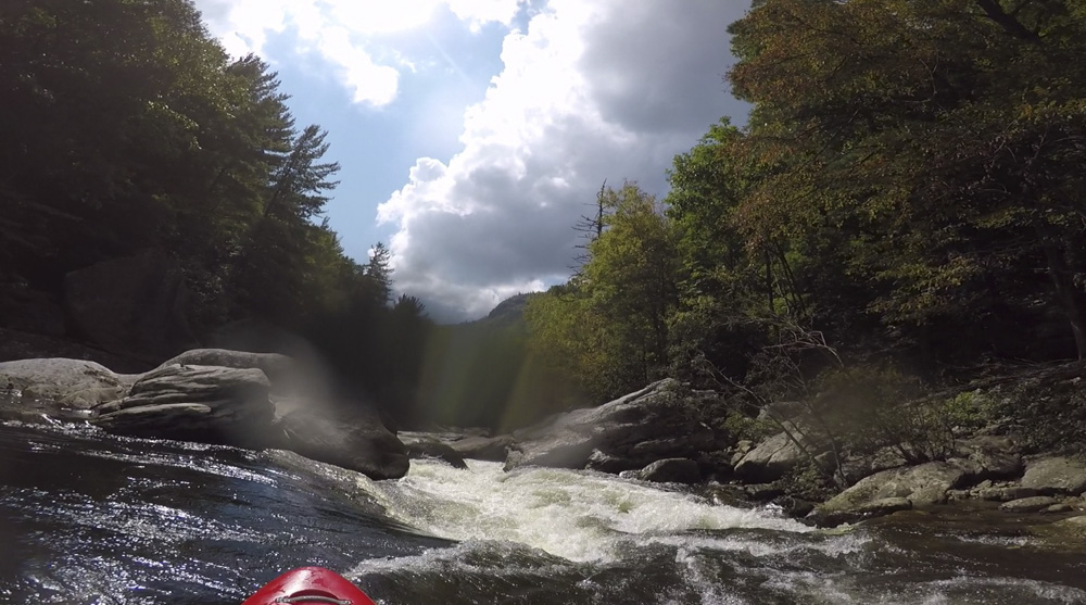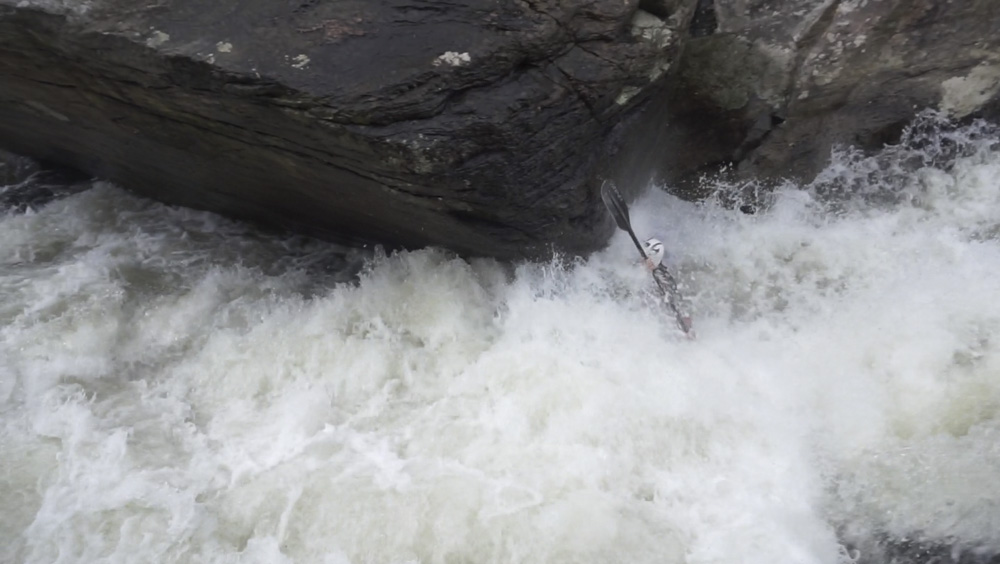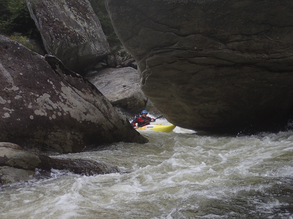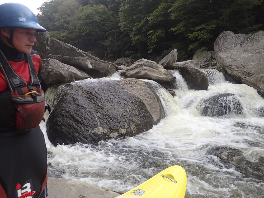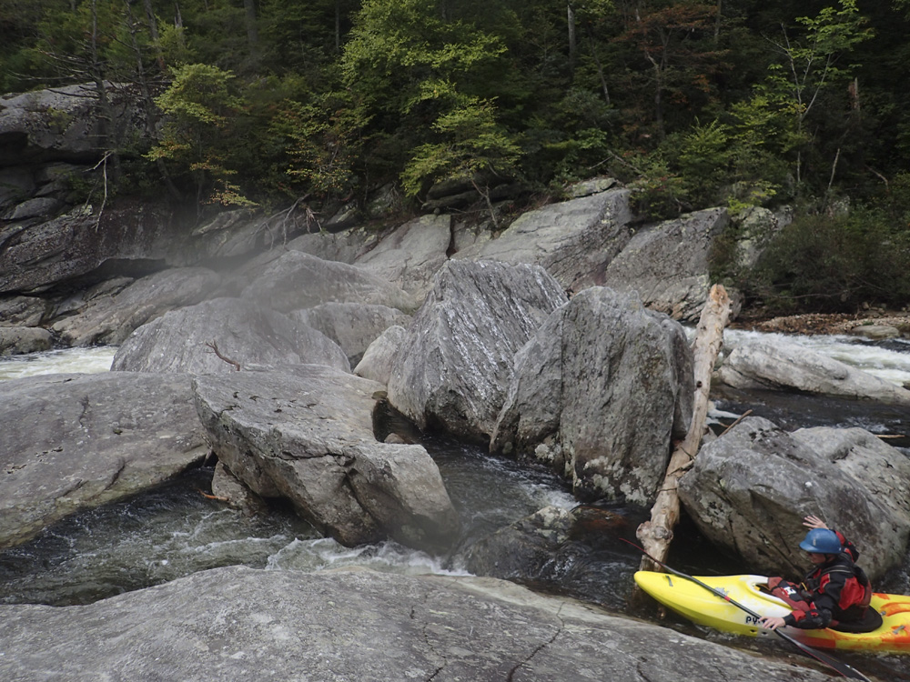 Welcome to Bob's World (V- to V). At low flow, this one gets more consequential. The rapid has a few parts. The river splits down an island formed by a large rock, we ran the left side. The top was a nice boof using a lefty. Next is a slopping rock center that we went over, if you go left it is ok, but this kills momentum and will force you into being on the right side of the river due to a cross current over there. For the final move, the name of the game is to drive through the curler with left angle as the right side goes into the undercut right wall. Just don't be too far left too early as you won't carry the momentum you need. A friend of mine has gone under that rock and it wasn't pleasant. At higher flows, the bottom curler is more benign.