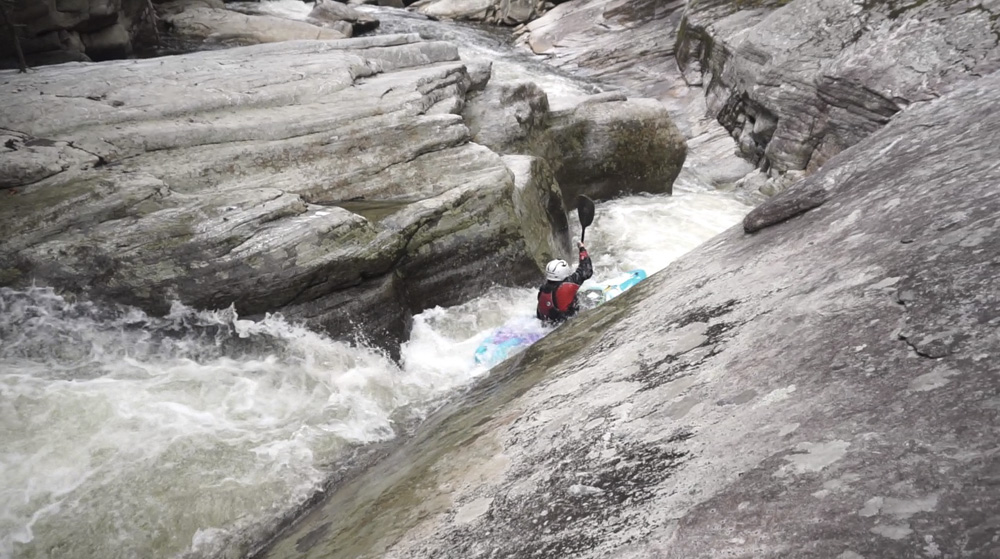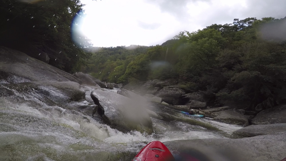China Boof (IV). The next horizon is this boof which you sometimes go deep on. Pretty much boof center. Downstream are some fun slides, a few manky rapids, and a sneak or two.
