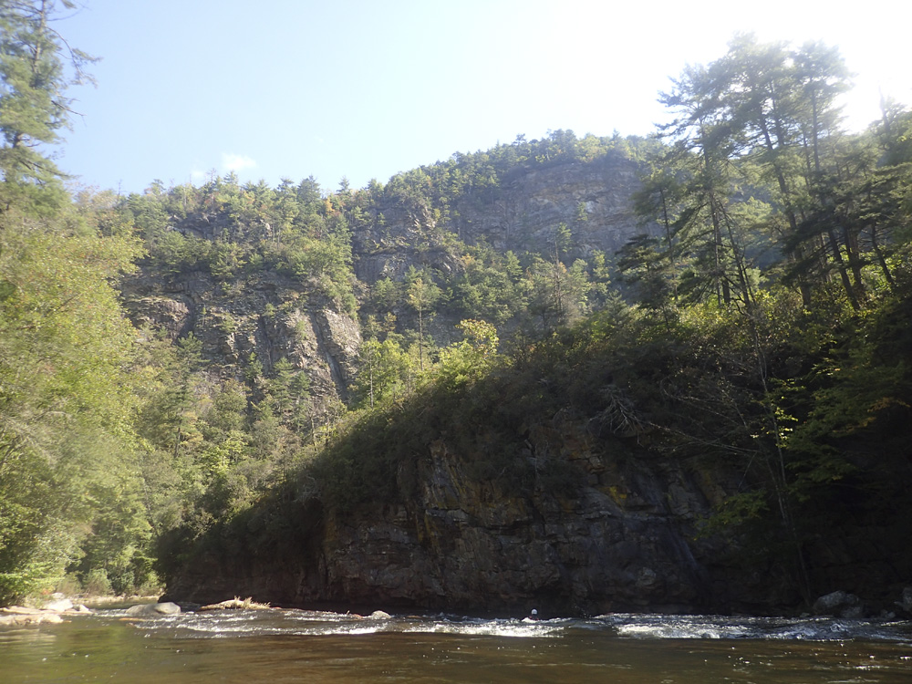 Wall (IV). After one small boogie rapid, you get this sorta nasty rapid where the water all flushes towards the left wall which is undercut. You want to drive hard right up and over submerged rocks and through holes to get right.