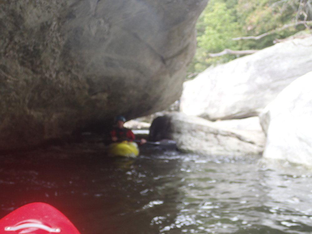 Hallway (IV+). The river pinches against the left wall, run down the wall. It then opens up a smidge before pinching down again. The second pinch is the important part. The exit of the second pinch is split by a rock, be right of the center rock for a nice friendly ramp. This dumps you in a pool. On the far side of the pool is a huge rock blocking most of the river, it is a little blind, but the right side was good to go. Note that you want to cut back to the left as there is a small sieve on the right just below.