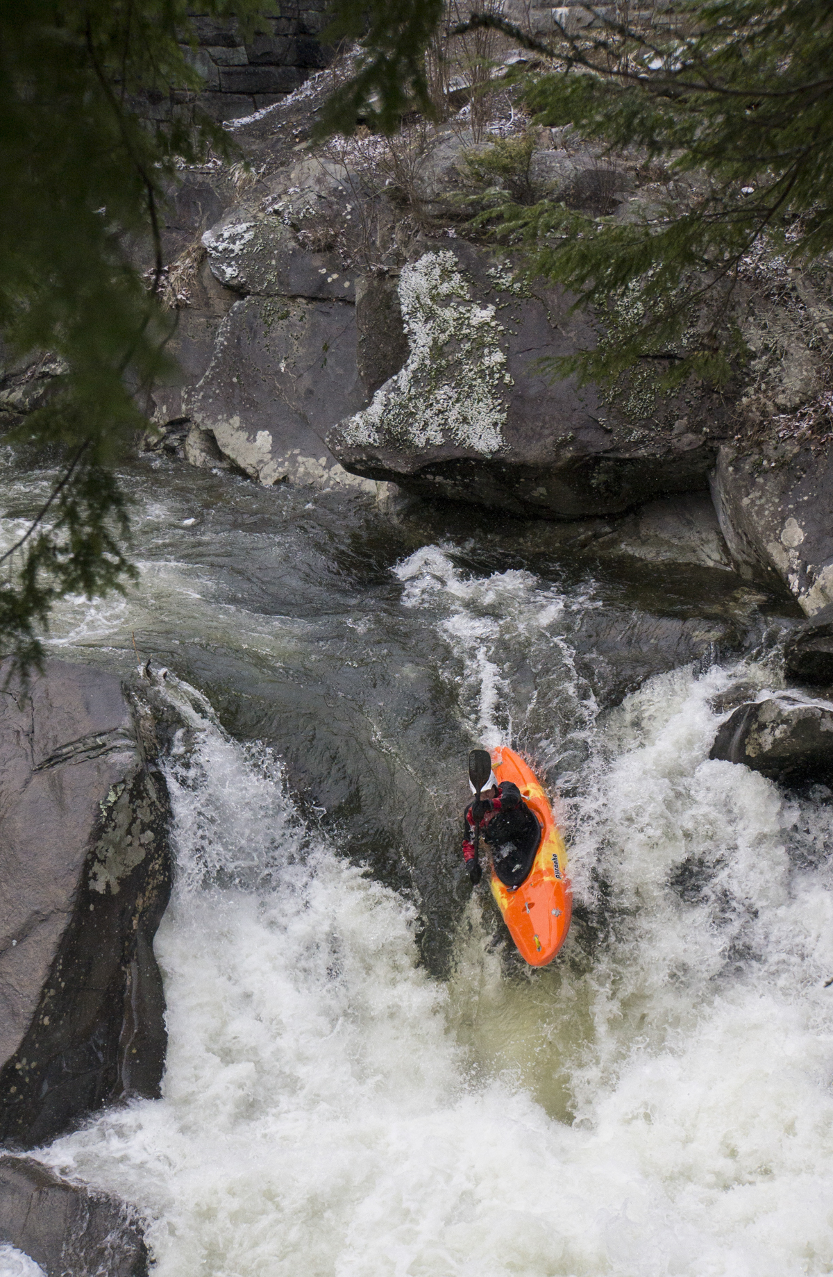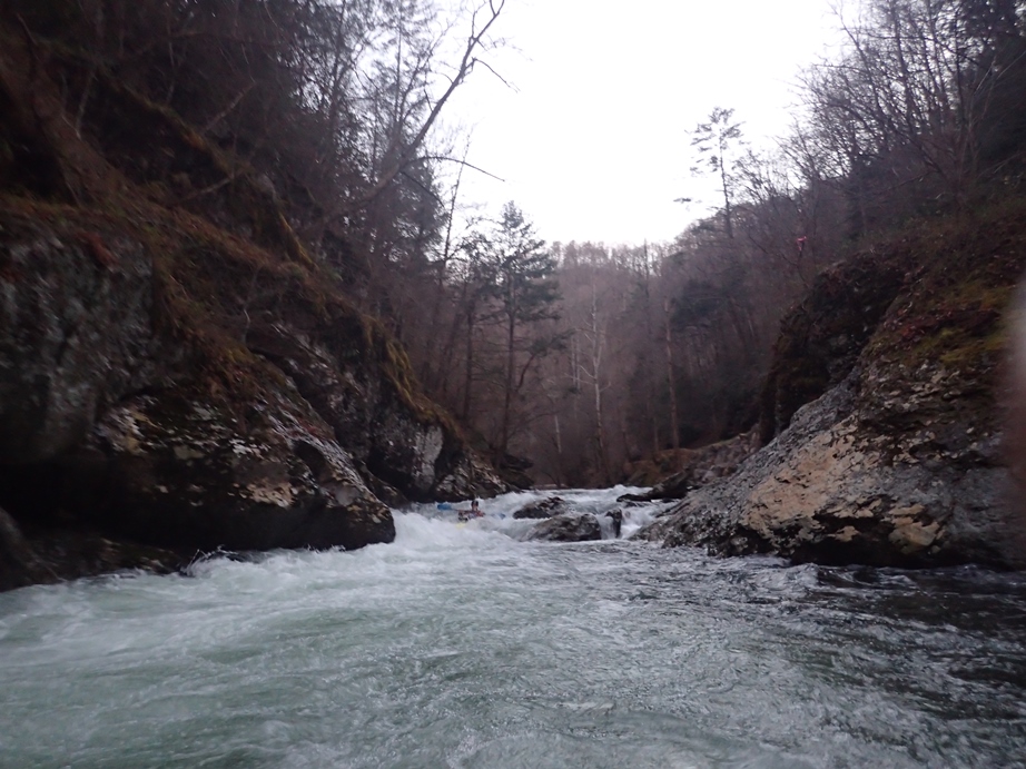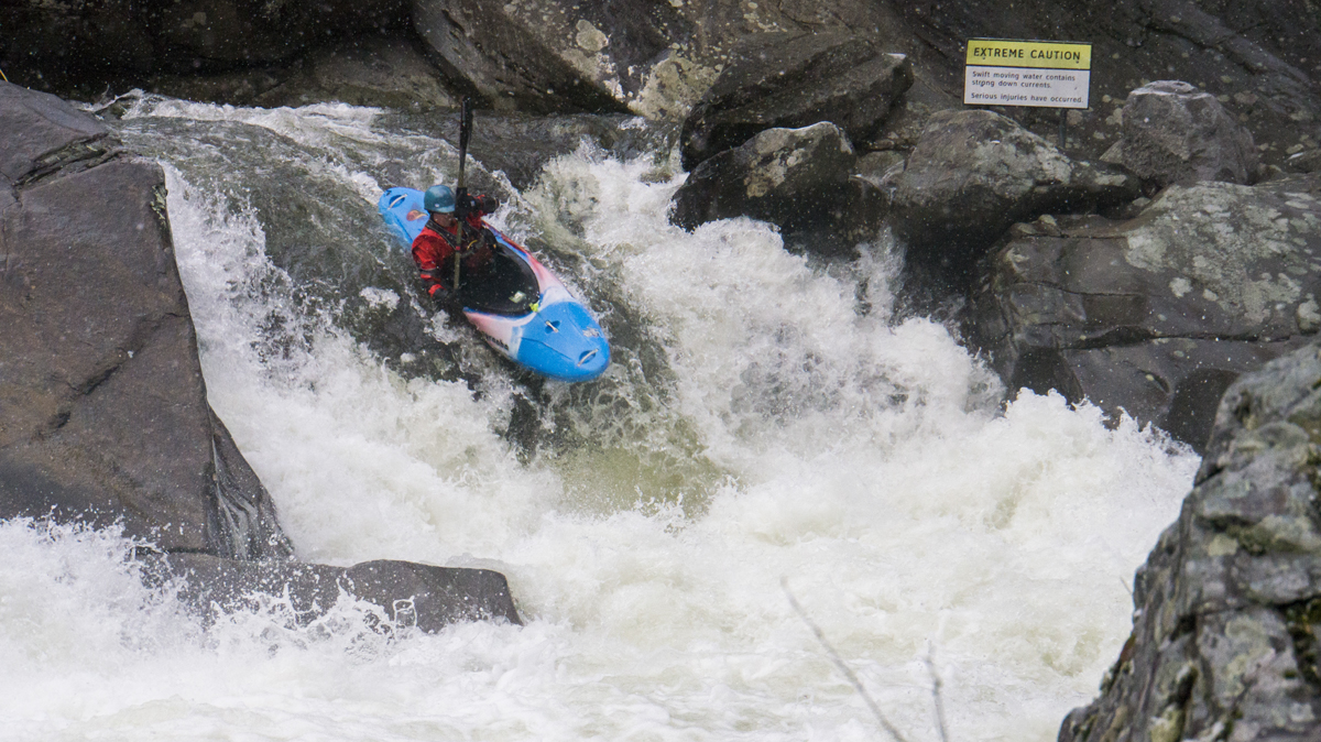 Sinks (IV to IV+). It looks big but man is it just plain old fun! Run center moving left and launch off a nice flake with slight left angle. You don't want to be straight going off of it as there is a rock in the landing in the middle. The hole is super friendly through if you land between the shore and that piton rock, you just blow right on through it. Super fun rapid and surprisingly easy for something that is ~8 feet tall pool to pool (it ramps into a delayed boof off of the flake).