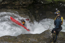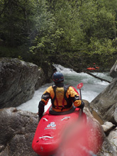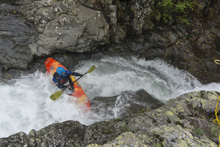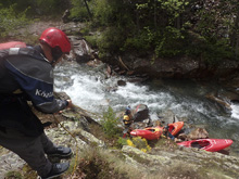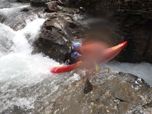 - Second Slide (V). Only Diane wanted to run this drop. It was a slide that lands in a hip check and crack. She then eddied out to say the line was good to Reiner who was still thinking about it. She didn't realize she was flushing out of the eddy and by the time she did and went to turn downriver, instead she broached against the walls and pinned just above the small exit ledge. Luckily she was stable, Harry got a rope on her immediately and Reiner and I downclimbed to unwedge her.