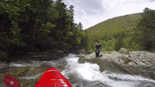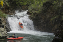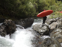 Slab Boof (V). Immediately downstream was another scout. Scout left. Only Diane and I wanted to run this one as the middle teir was maybe 8-10 feet tall and landed on a slab. But it was like stuff we do in the South East all the time so we decided to go and let the bow drop to take the impact. The first tier is a slopping hole that we drove down the middle for. The second tier was boofing the right side onto the slab, and the exit was a small ledge that could be run anywhere. The very next rapid is actually maybe just the exit of this, and should be run in the far right small channel as the left side has a hidden large rock just over the horizon.