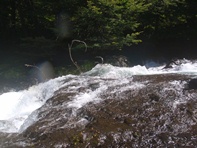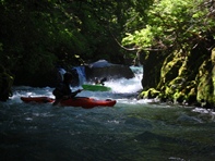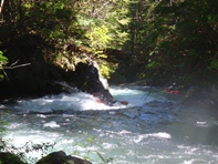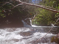 This river was a wonderful surprise. Prior to our trip, I saw plenty of photos of the waterfall near the put-in, the clean 18-20 foot drop has easy eddy photo access from both above and below and thus sees plenty of film developed of it. What I did not expect was the quality of the whitewater that laid downstream. What we found were several multi move rapids in tight walled minigorges and a few small vertical drops. Sadly, half of our team walked away with a sour taste in our mouths as we blindly dropped into the last rapid (100 yards above take-out) and one member got beat and was forced to swim, where he then proceeded to body recirculate three times. While that was going on, another team member dropped in and tried to plug under the boat in the landing zone and took the boat to the face resulting in an one inch wide hole in her lip. Other than that, the river was great fun. As it was, the final drop is very scoutable and portagable if desired, we just didn't realize it was going to be as big as it was until it was too late and the cluster f..k began.