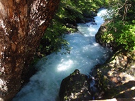 Mini Gorge (IV+). It is probably wise to scout this section before putting on. There is a small bridge over the water marking the mini gorge. Once you drop in there are no eddies. Also, if you are unsure it would be good to have safety here. There are three or four distinct drops. The largest of which is directly under the bridge and totally surprised me as I only looked up and downstream from the bridge. All the moves are into large holes in tight confined spaces. Great fun though. There is also an eddy on the right just below to collect pieces in which is important as the next rapid has wood danger.