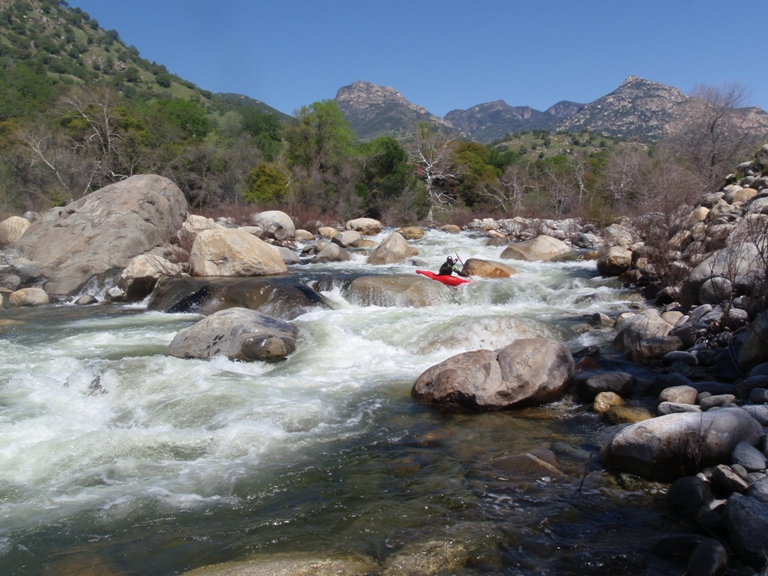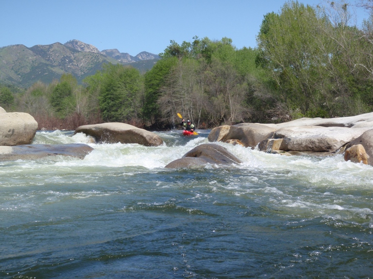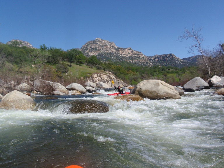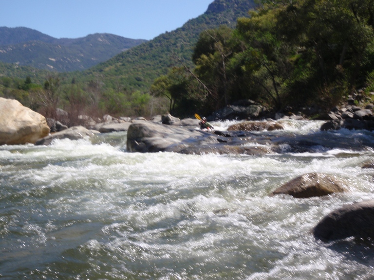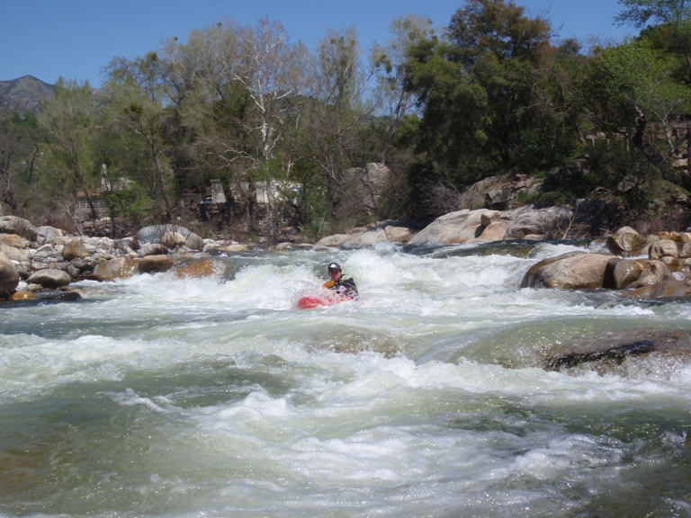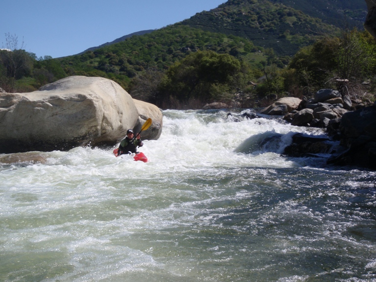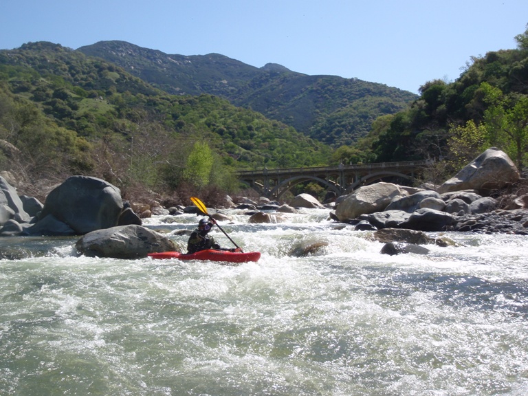 One last thing, this river has turned into a 2-3 mile short section breakdown much like the Kern. Every place that there is a bridge or access point, the run names change. The top half mile mentioned in the paragraph above is call the "Park Boundary." Gateway runs down the Dinely Bridge 3 miles below Pumpkin Hollow, and Dinely runs down to the North Fork of the Kaweah. Stanley Holbek on the other hand only have 3 runs. In their Hospital Rock write-up they include part of what is now called Ash Mountain. In their Gateway, the include the tail end of Ash Mountain, and all of Park Boundary, Gateway, and Dinley. This write-up includes Gateway and Dinely, it also only has the big rapids. There are many many class III rapids that all blended together in my mind.
