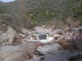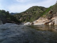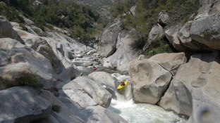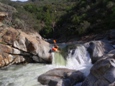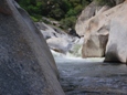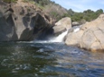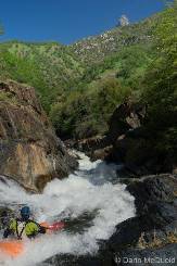 So I will begin by saying that I did not get the chance to put it at Bucks Flat and run the entire Hospital Rock run. Darin and I got into town for a one week Kaweah vacation, arriving at 3 pm. Due to the time of the day and the fact that it was my first trip down the river (read "am chicken and want so scout everything and reserve the right to portage everything) we opted to put-in at the turn-out just a mile or so above the 420 gorge. This means that I did not get to run (walk) Chuck's, V-slide, Little Niagra, nor the double drop just above our put-in. Our plan was to get back on the stretch later in the week and at that point put-in higher up and complete my personal first decent of Hospital Rock. However, fate had other plans. Near the end of the run I began taking on water, I suspect the rock at the base of the dam above Zero-60 caused my boat to give up the ghost. Three small cracks all going across the boat. Due to this damage and the fact that the following day on the Upper North Fork those three small cracks got together and formed one large three-inch hole in the bottom of my boat, our Kaweah trip was cut short and I was left with an incomplete decent of the run. Oh well, another time I will get back in there I am sure.