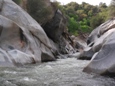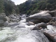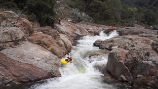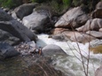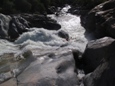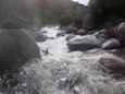 Seam to a Rock (IV+). A large horizon line with what looks to be a rock just downstream and a very chocked off exit turns out to be much mellower than first inspection. Plug away down the seam, avoid the rock (which is not hard) and all the channels amidst huge boulders empty to a pool.