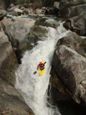 Chute AKA 60-0 (V- to P). A very large undercut on the left at the top and a sieve on the far right at the bottom. Enter moving right and then just ride the turbulence down to the 90 degree turn, hitting the curler off of the rock forming the sieve and try not to flip. I did flip in the exit curler and hit my head once or twice before rolling up. Still a great rapid, looks a heck of a lot worse than it is. Update 2023: A rock shifted and has closed this rapid out, sending the majority of the water to the right and into a sieve. Extraction looks difficult but doable if you are in the last minute make or die eddy on the right at the sieve. For now, mandatory portage on the left.