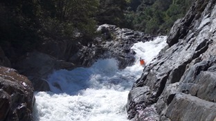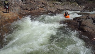 Boogie (IV+ to V-). Below are a few bedrock boogie drops. The one directly below has a sticky hole at the bottom and is two part. Scout this if you haven't been in before. Enter a boof in the middle heading right, not too much or you get rejected by the boil. Too little and you drop into the meat of the hole below.