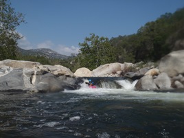 - No. 11 (IV+): Once you see the restaurant/houses on the right, you know you are at the crux section. After a short entry which we ran down the left if I recall you get to what used to be a super ugly sieve. In the years since the Kaweah write-up was authored, the rock that caused the ugliness moved. There is still a hazard if you run down the far right of the slide as it goes into an undercut and sieve combo. However if you are center or left, you just punch the hole and all is good.