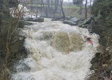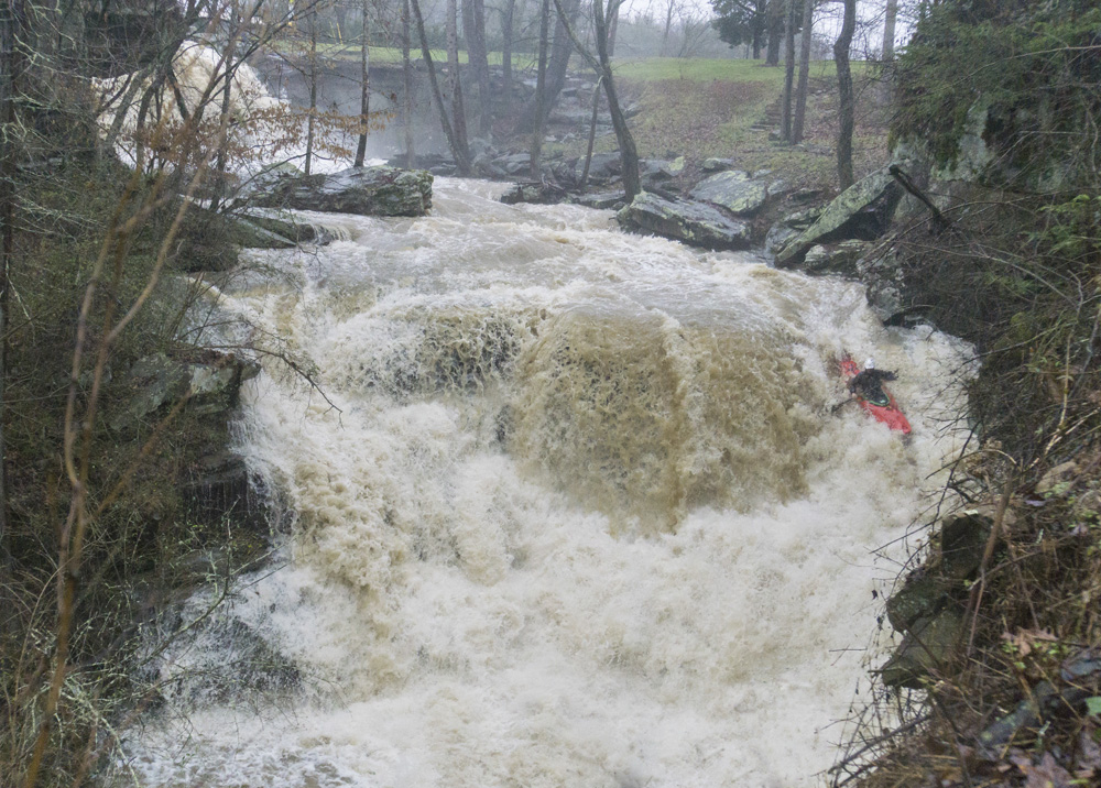 - Coalfield Falls (V to V+). This drop is bigger than the one upstream, as it is two part. The first drop is a rolling 18 footer that needs to be boofed flat, in the center. This then quickly moves the 50 feet downstream into the second tier which is a 25 foot tall cascade that needs to be run far left where there is a smooth slide around the nasty middle part of the cascade and then deposits you in a large hole that you want to be far left on. Boat around the corner to then walk up to the private property, assuming permission was given to you.