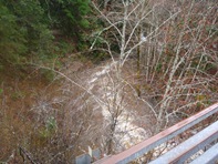On the third day of our end of 2011 trip, we woke up to swollen river thanks to the 4.5 inches of overnight rain. With all the main stems raging, and our plans for Diamond Creek nixed thanks to over 20 feet of water in the North Fork... we headed up to what we expected to be the easiest section of new (to us) whitewater in the area. Even at the top of the Middle Fork, we knew that we would be on flood stage water. In a river bed that is only 10 feet across, we also knew that this would likely create a significant hazard for wood interactions... a fear that was realized a few times.