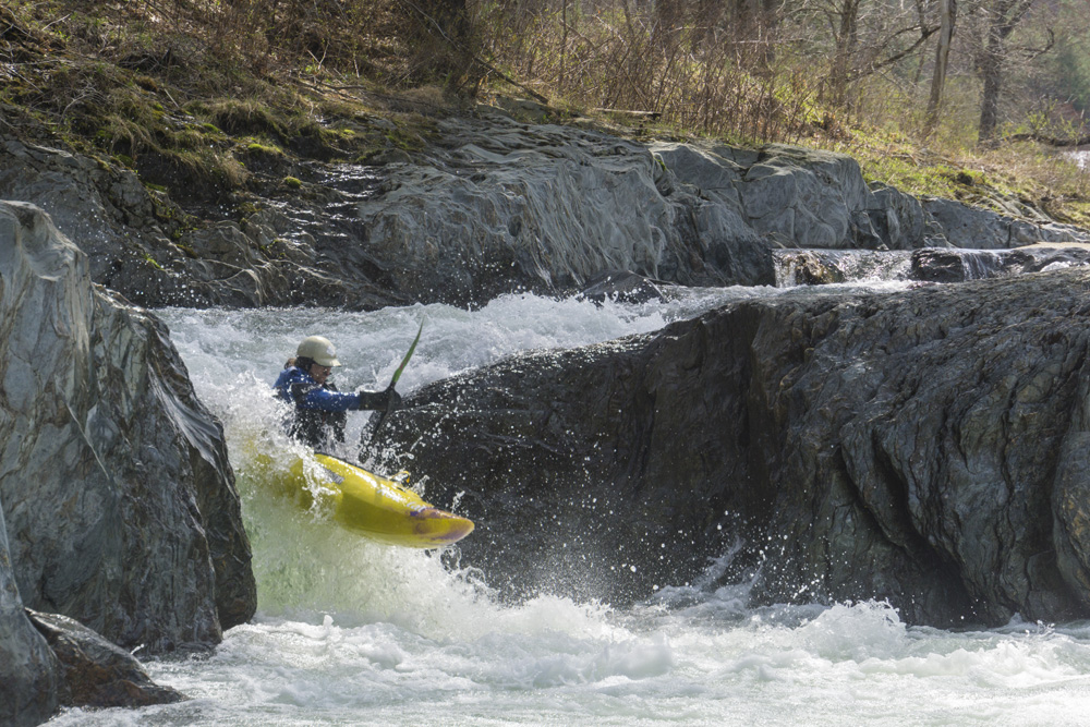 - Horseshoe Falls (III to IV). I think this one is harder at lower flow as we could not do the straight forward boof and avoid the sharp corner and ledge into the cauldron below. Normally you run a two step easy boof in the center. For us, we ran the right channel which makes a 90 degree turn as it drops over a 4-foot ledge into a pocketed hole. Make sure to boof it! We then got out on the left and walked up for laps!