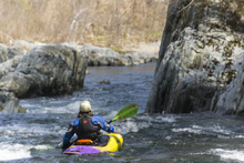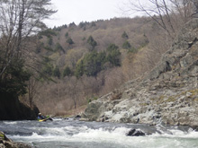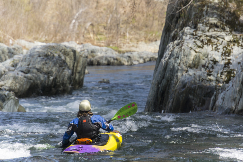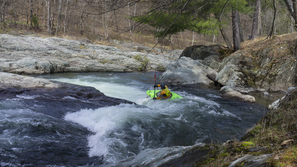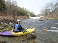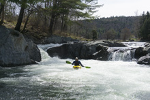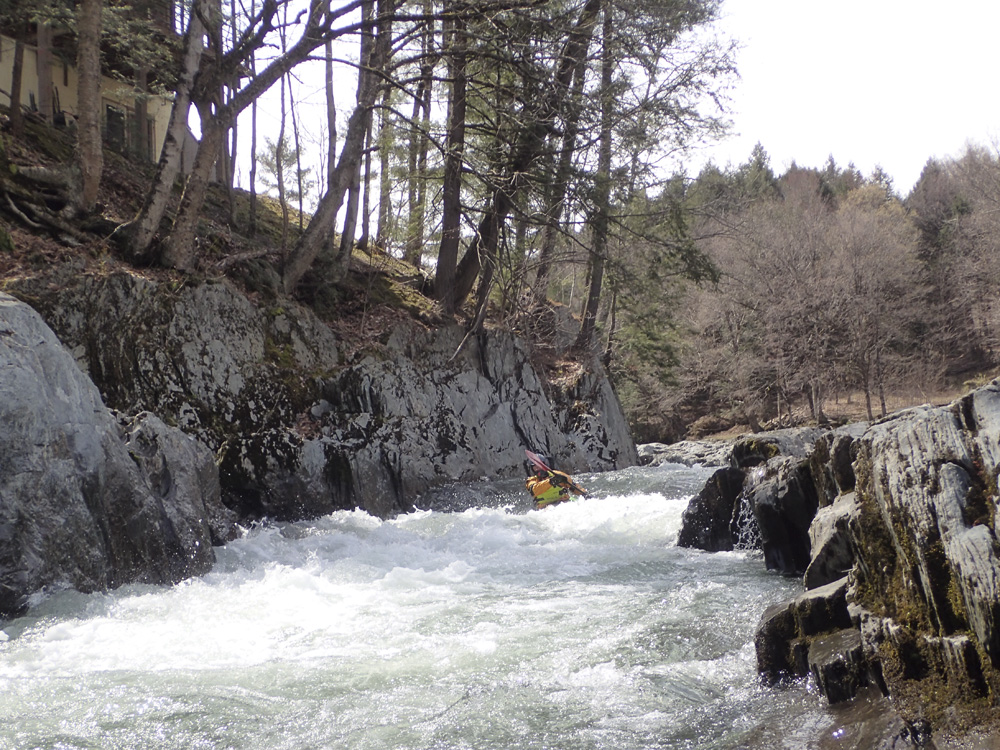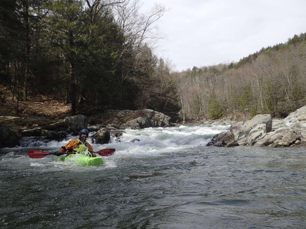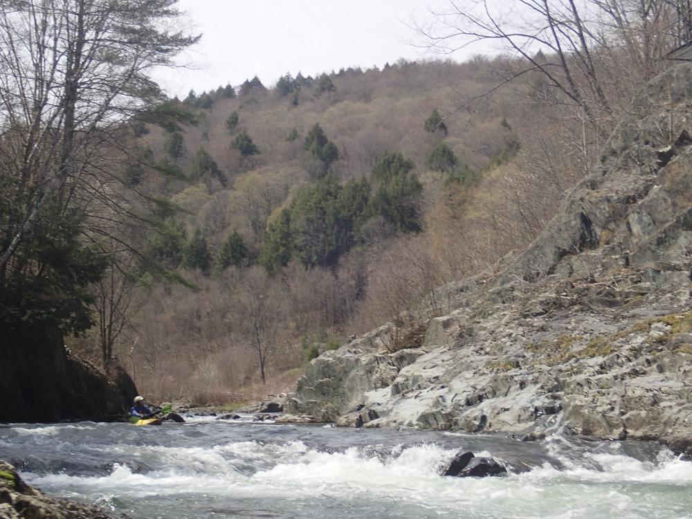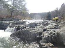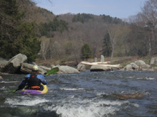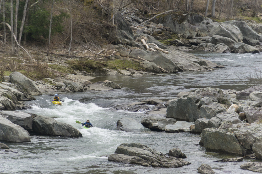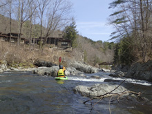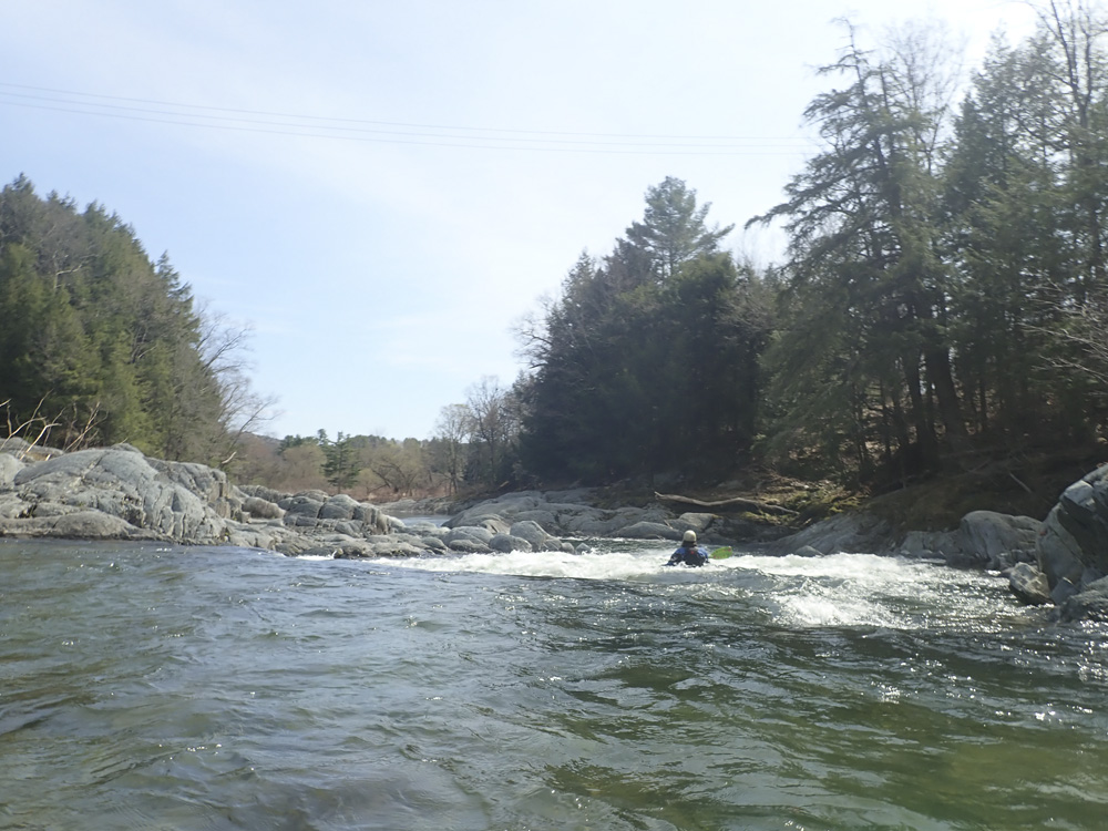 The run starts off right below a dam and goes immediately into some nice gorged out action before opening up to a long pool where at these low flows you had to be careful to stay in some deep water. As you exited the pool, you got to the biggest rapid of the run. At normal flows you boof down a double drop in the left channel to avoid the 90 degree turn and 4 foot drop into a sticky horseshoe hole. At these low flows though the boof was dry and the right line was sweet. We carried back up and ran a couple of laps it was so good. Below, you stay in a gorge more or less and have some nice maze rapids and a few small holes to punch before you hit the confluence with the Winooski and the quick flat water paddle down to take out. Each lap takes less than an hour, so lapping is the name of the game here.