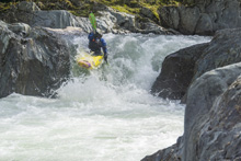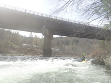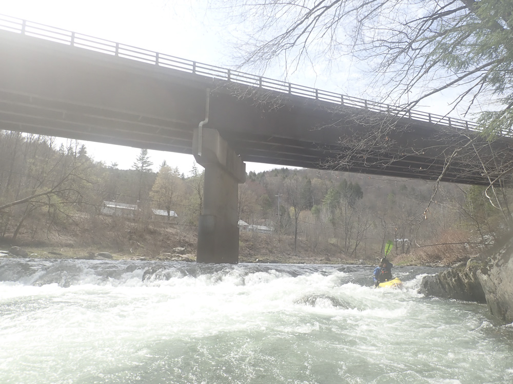 Bridge Drop (II+). Immediately downstream, and under the bridge, is a little ledge that was slightly tricky in that the obvious ramp down the left had a rock that it led to. So moving back to the right on the ramp was the name of the game.