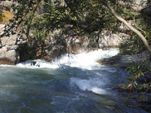 Boulder Garden (III to IV-). 100 yards downstream is a small boulder garden. There is a cool spring coming in on the left dropping a good bit of water in half way down. We entered left and worked center. It was straight forward enough and had an eddy at the lip on the left in case you didn't scout from the trail on the way up. Below it mellows out for a bit.