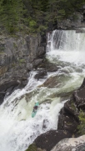 - First Falls (IV+). The first falls feeds directly into the second one, but you can catch an eddy on the right below. Scout from the left above. The line is just right of center off a ramp to a boof. Make sure you boof back to the right otherwise you run the risk of catching your elbow on the way down. Also, folks seem to lose track of which small channel is the right one from the small eddy above, so look carefully. This falls is ~18 ft tall.