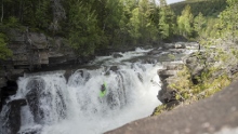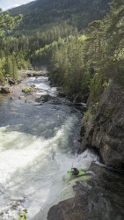 Telemark is the first region to run in Norway each year. Because of that it is typically dry by the time that the hordes descend on Voss looking to throw themselves off of big waterfalls and slides. In 2015 however there was a very large snow pack (~200% normal) and with the record coldest May on the books, snow was not in limited supply... and therefore neither was water for the rivers across Norway. Our plan was to start our trip on this short section of river that is only 1 mile long and boats a back to back combo of 5 waterfalls. Putting on around 5 pm our plan was also to camp at take-out. A pleasant dirt turn around area right on the water and only a 5 minute walk from the lower falls.