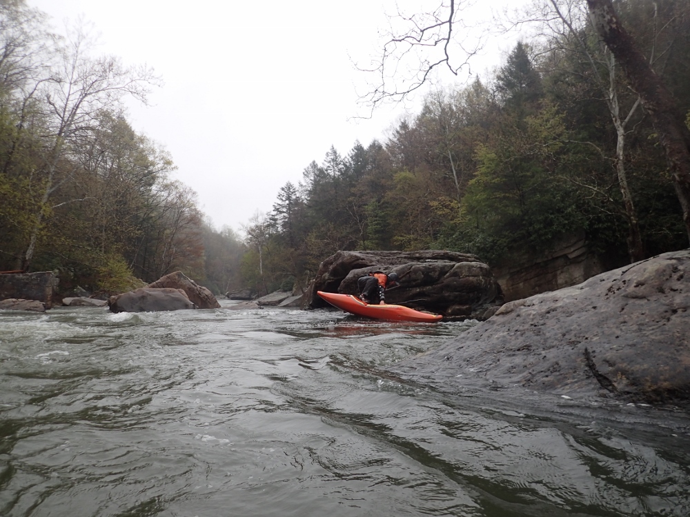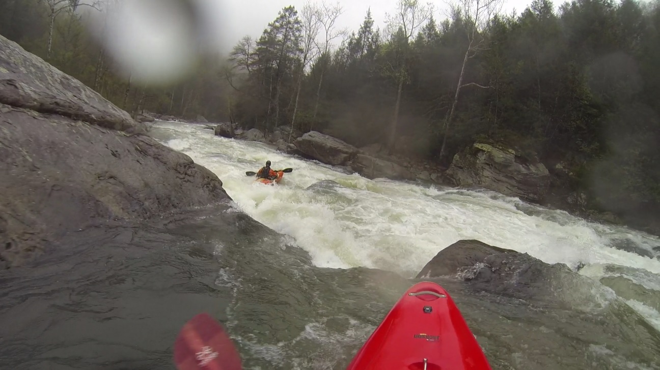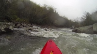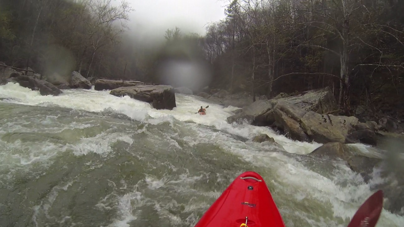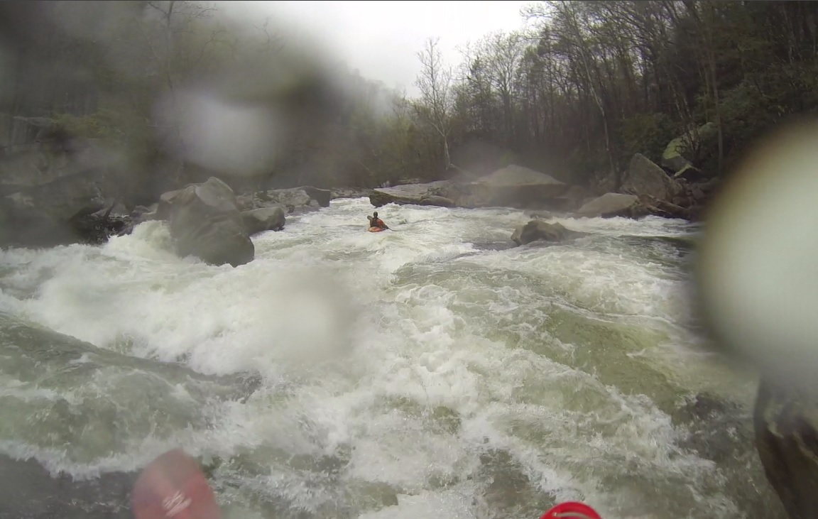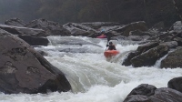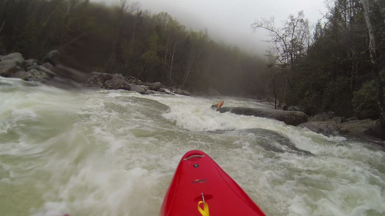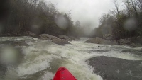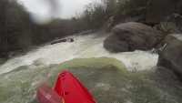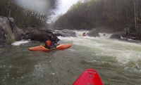We had ~800 or so on the gauge, it was in the process of going up due to the rain from all evening. This gauge though is well upstream and usually you add 200-250 cfs to get a general estimate of what the flow will be. So we had ~1,000 to 1,100 cfs. Lots of people consider 1,200 cfs their limit, some up to 1,500... though others still are more conservative and call 800. From California, this river at 1,050 (we will call it that), felt like a perfect flow. The sieves were filled in (for the most part), the rapids were full of water and slightly pushy, some holes were big, but the boofs over them were straight forward. I would compare this to Cherry Creek on the Tuolumne at a similar flow I think, though perhaps this is a quarter to a half step easier. Though at the same time, WAY more dangerous! This river has claimed 3 lives that I know of, and I am sure the count won't stop there. Several sections of rapids are linked up, a swim in one rapid could easily spell disaster if your group allows you to swim into the next rapid. So, stay cautious and be ready to rescue!