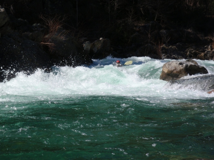 Five Alive (IV+). A chute which at low water needs to be hit on the far left side of as there is a rock in the center. At high flows it is go anywhere, you pick up speed and blast through the bottom, I still edge to the left side of the large wave. Update 2017: Per Gavin Reiser, this one apparently has changed and now has a piton in the center where the curler used to be. Avoid to the left.