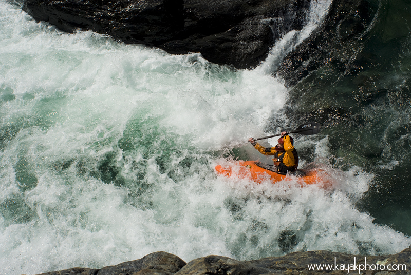 Update: In 2010 (or so) the middle rock that formed the large hole fell over. Now the typical "main line" is to cut from the middel to the left straight through what used to be the no go area. It is all good to go now, just moves you right around the rock and you can keep your head dry. The sneak on the right now also needs more water as a small crack channel opened up at that causes the water to drain at low flows rather than spilling over the ledge at the bottom on the right. At flows over 800 or so the sneak is filled in enough and good to go.