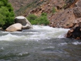 As part of my quest to complete the runs on the North Fork of the Kern that I missed on my lone previous trip, we decided to run Fairview as a continuation after running the upstream Limestone run. No knowing about the culvert that allows you to run the Sidewinder rapid immediately below the dam, we hurriedly walked down the road which lacks a shoulder and put in above Bombs Away. Bombs Away is a stout class IV+ rapid that can easily be skipped by putting in at the turn out 100 yards below it. By skipping Bombs Away you are left with a much easier class II+ to III- run.